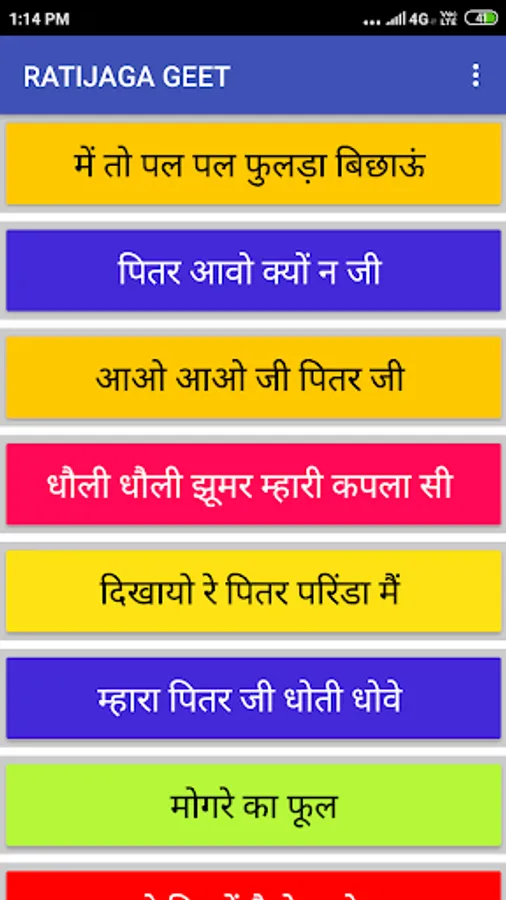 This app will help you to learn Ratijaga Geet with their raag Or tune. Ratijaga geet are sung on various occasions like at Vivah, Birth etc. We are providing you these songs with their lyrics too. At the time of pooja, you can play these songs.