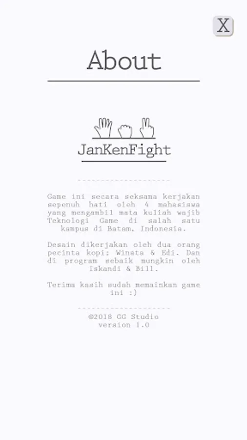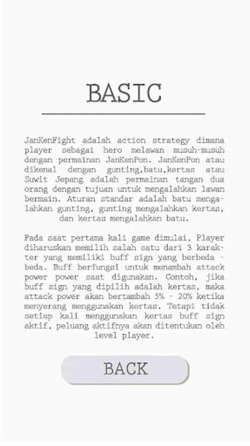 JanKenFight adalah action strategy dimana player sebagai hero melawan musuh-musuh dengan permainan JanKenPon. JanKenPon atau dikenal dengan gunting,batu,kertas atau Suwit Jepang adalah permainan tangan dua orang dengan tujuan untuk mengalahkan lawan bermain. Aturan standar adalah batu mengalahkan gunting, gunting mengalahkan kertas, dan kertas mengalahkan batu . Player harus mengalahkan berbagai jenis musuh dan boss dengan tingkat kesulitan yang semakin tinggi setiap level-nya dengan bermain JanKenPon. Dalam beberapa level, player akan mendapatkan skill-skill yang dapat membantu mengalahkan musuh lebih mudah.