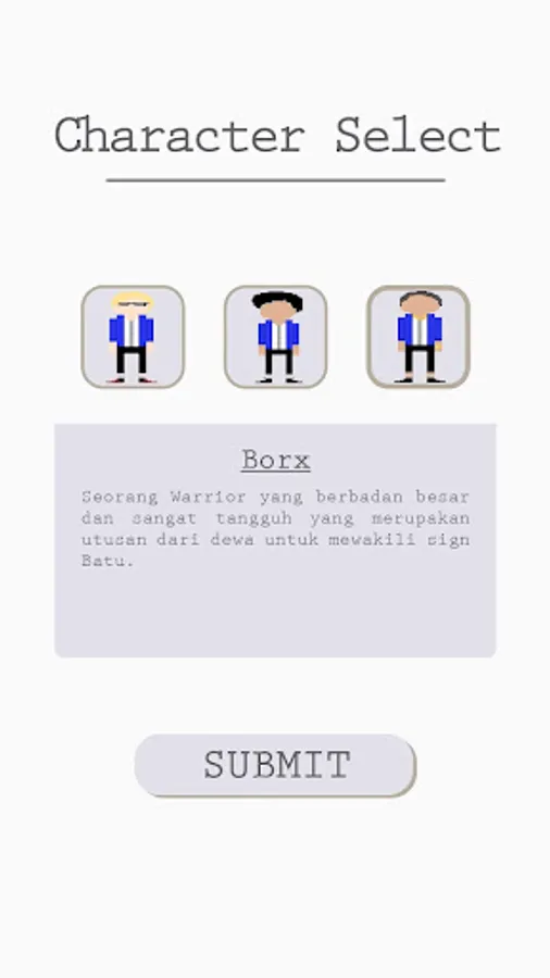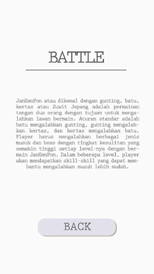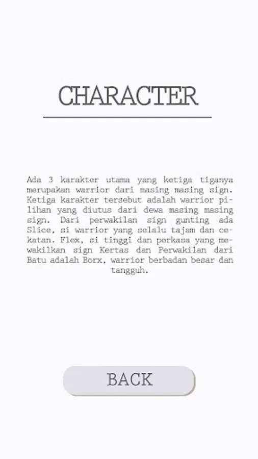 Game ini menggunakan konsep permainan yang unik dan juga Visualisasi Game Desain yang menarik dan juga game ini dilengkapi fitur untuk masing masing player bisa memilih player yang ingin mereka gunakan. Ada 3 karakter utama yang ketiga tiganya merupakan warrior dari masing masing sign. Ketiga karakter tersebut adalah warrior pilihan yang diutus dari dewa masing masing sign. Dari perwakilan sign gunting ada Slice, si warrior yang selalu tajam dan cekatan. Flex, si tinggi dan perkasa yang mewakilkan sign Kertas dan Perwakilan dari Batu adalah Borx, warrior berbadan besar dan tangguh