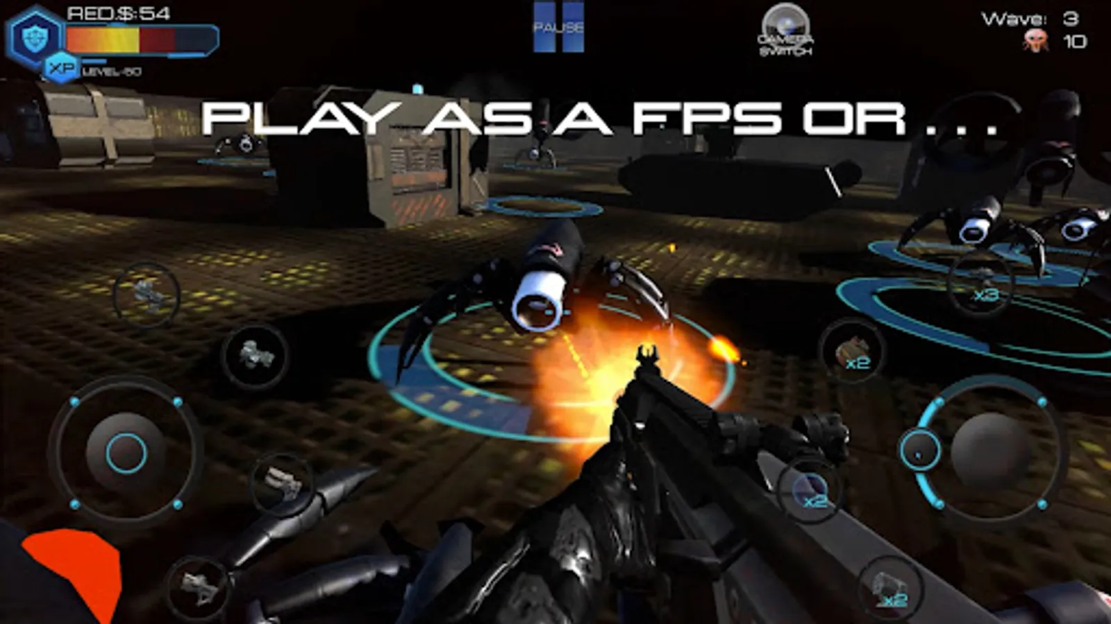 Whether you are playing it as a top down shooting game or a firstperson shooter , you can always buy weapons evolution and upgrades such as mech robots , turret defense , nuke and shield wall .