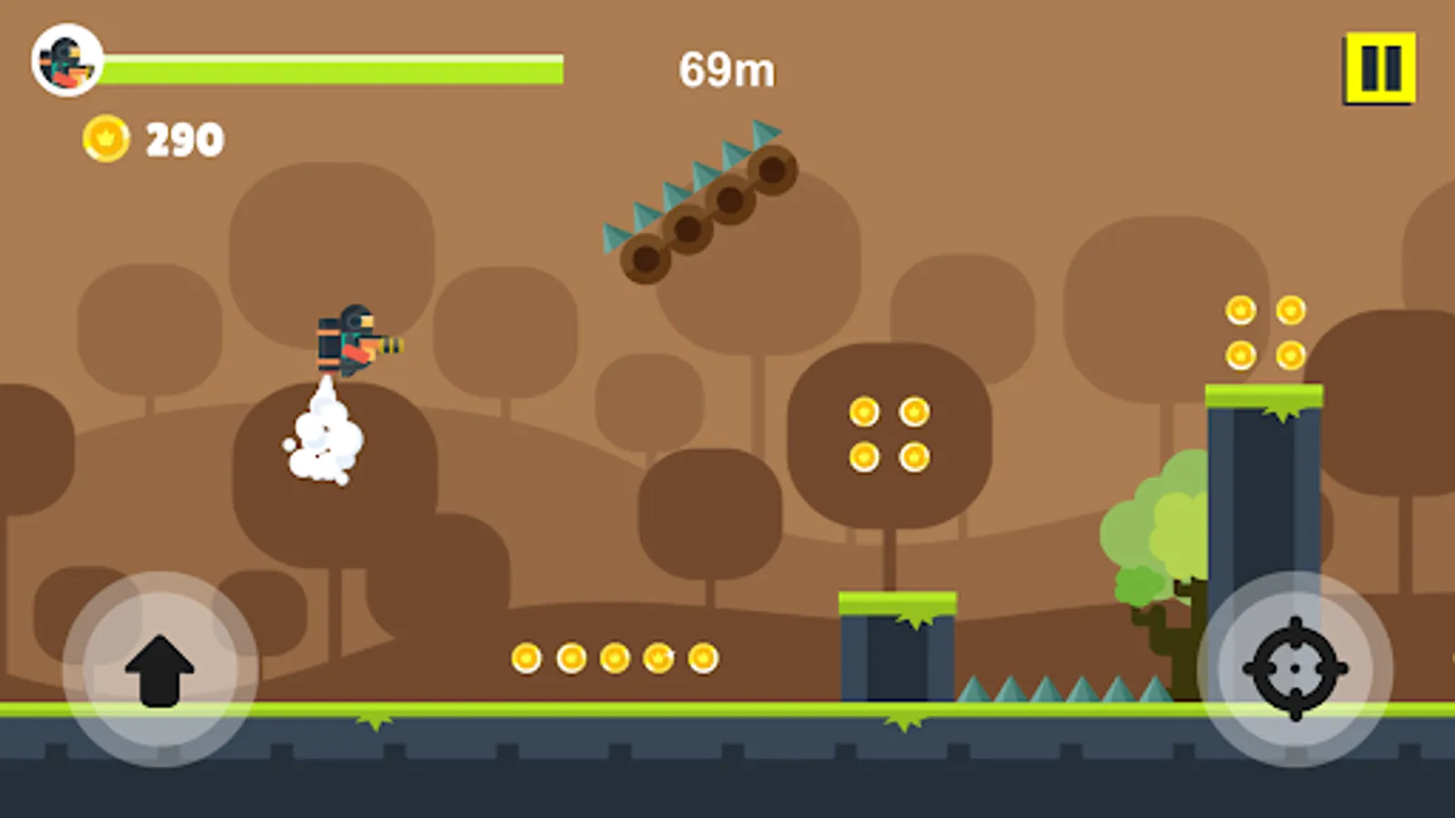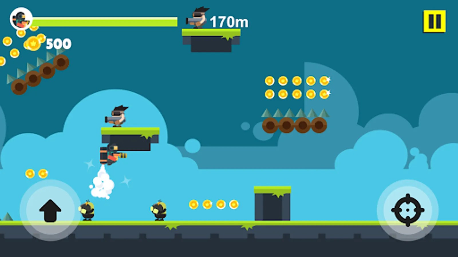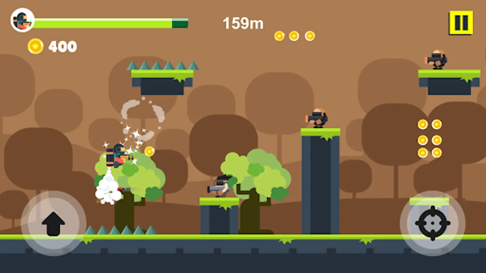 When you press the screen, the jetpack kicks in and lifts you to the skies. Shoot all the enemies by firing the gun in your hand while in the air. Watch out for the traps that come your way and avoid them. Enjoy playing multiple characters and chapters whenever you want.