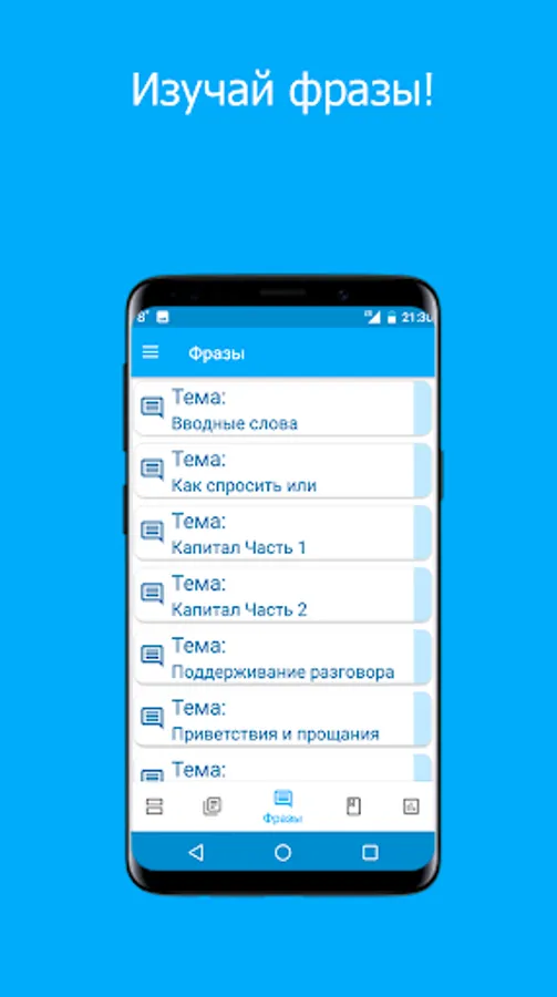 specially for you the most interesting and necessary topics have been selected. The application has my dictionary, in which you can add English words of your choice, and learn them. There is also a study of English phrases, with the help of which you can learn to speak English.