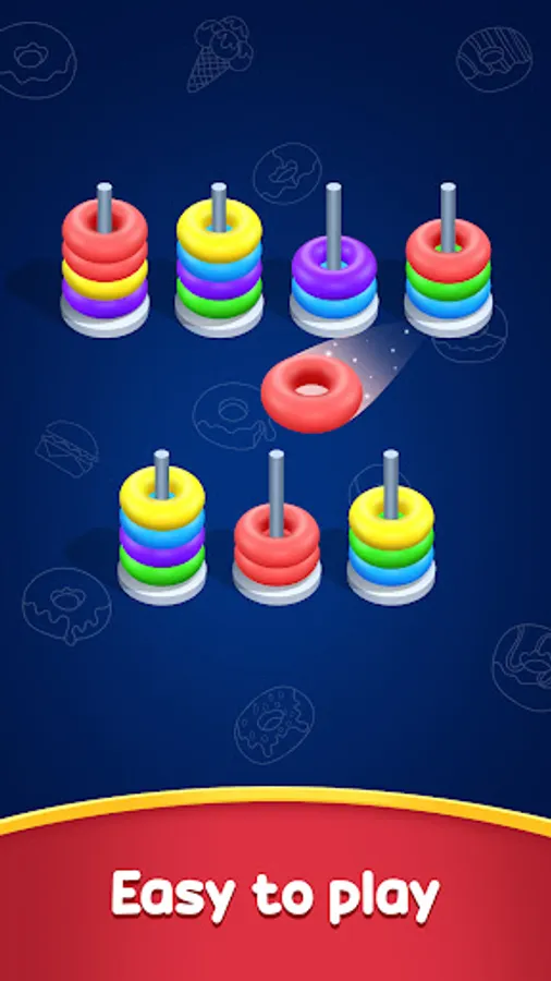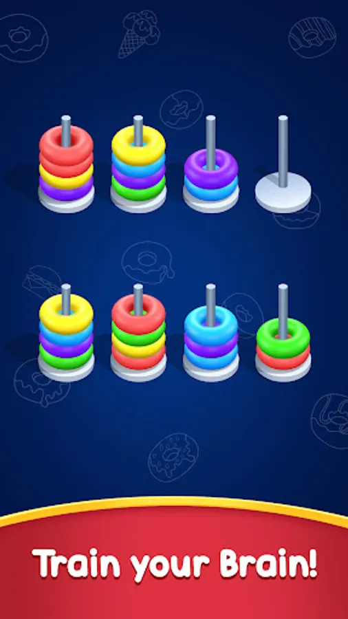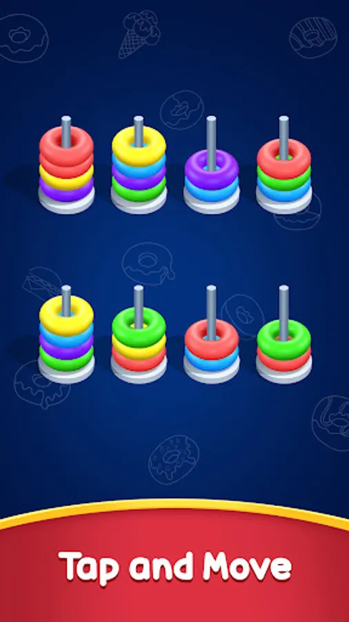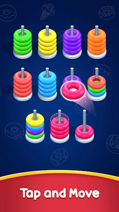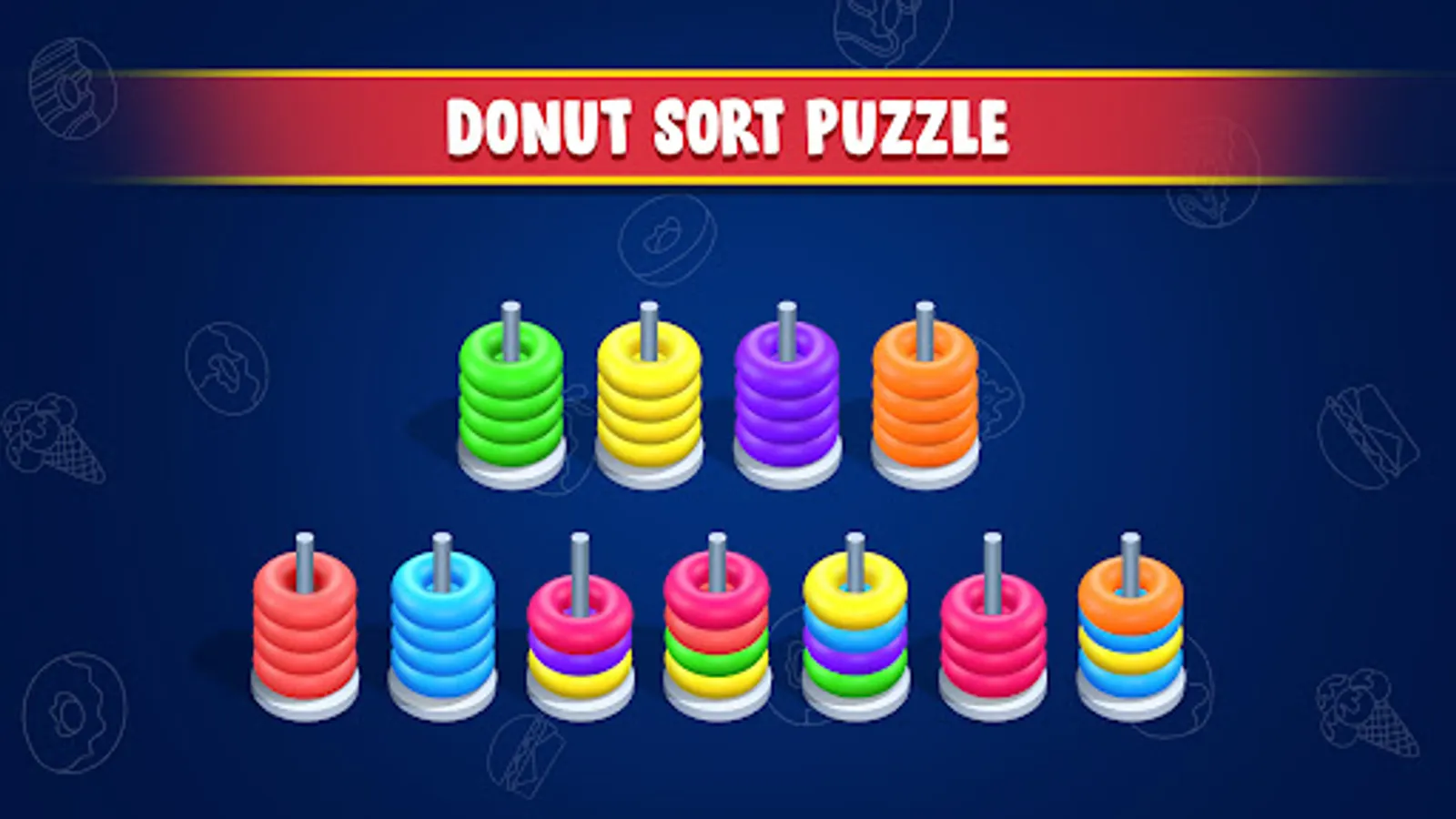 Donut Sort Puzzle: Color Sorting Game is a fun and interesting puzzle game! Try to sort the colored donuts until all donuts with the same color stay in the same place. A challenging yet relaxing game to exercise your brain!