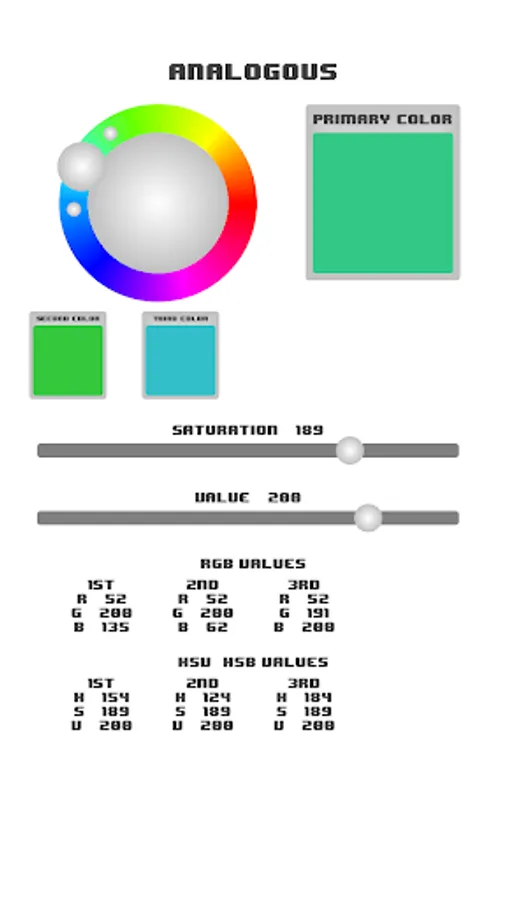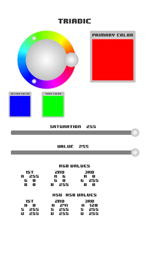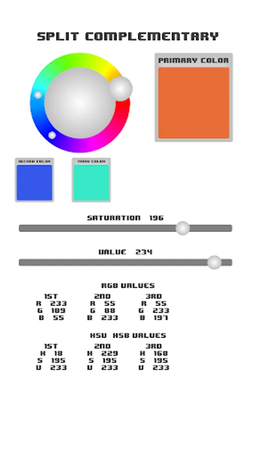Advanced Color Scheme Picker is a simple tool for artists and developers. It has a normal colorpicker circle and shows you the RGB and HSV values. You can also choose from a few different complementery color schemes which help you with find the best contrast/fitting colors to use in your paintings, doodles, apps and websites.