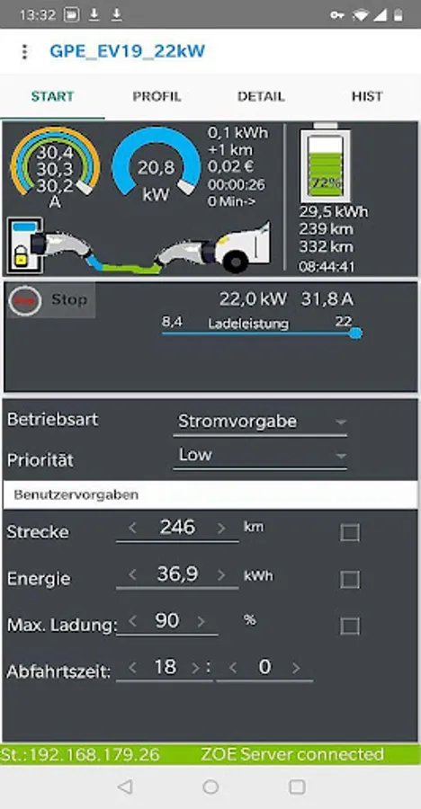 The charging processes can be carried out either automatically or according to the specifications of the user (charging power, distance traveled, priority). The app allows you to set these parameters and displays the operating status and essential information about the current charging process.