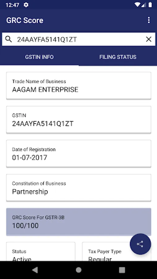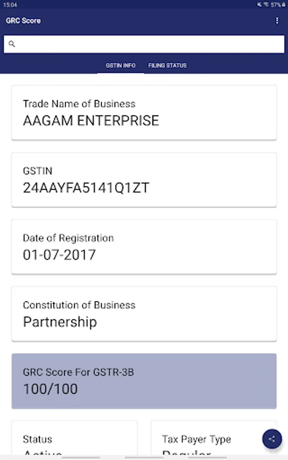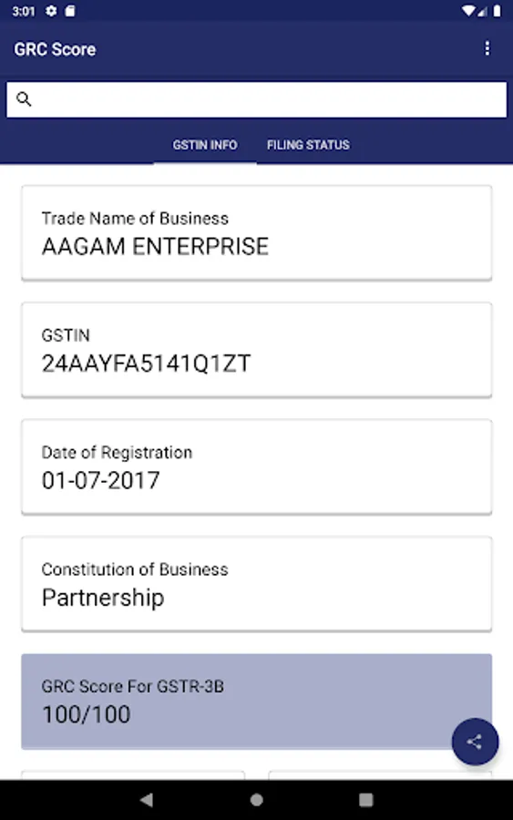 The app will connect to the GST portal in the background and fetch all the basic information about the GSTIN and display it on the screen. You will be able to see the company’s legal name, taxpayer type, date of registration and its GSTIN status whether active or not.