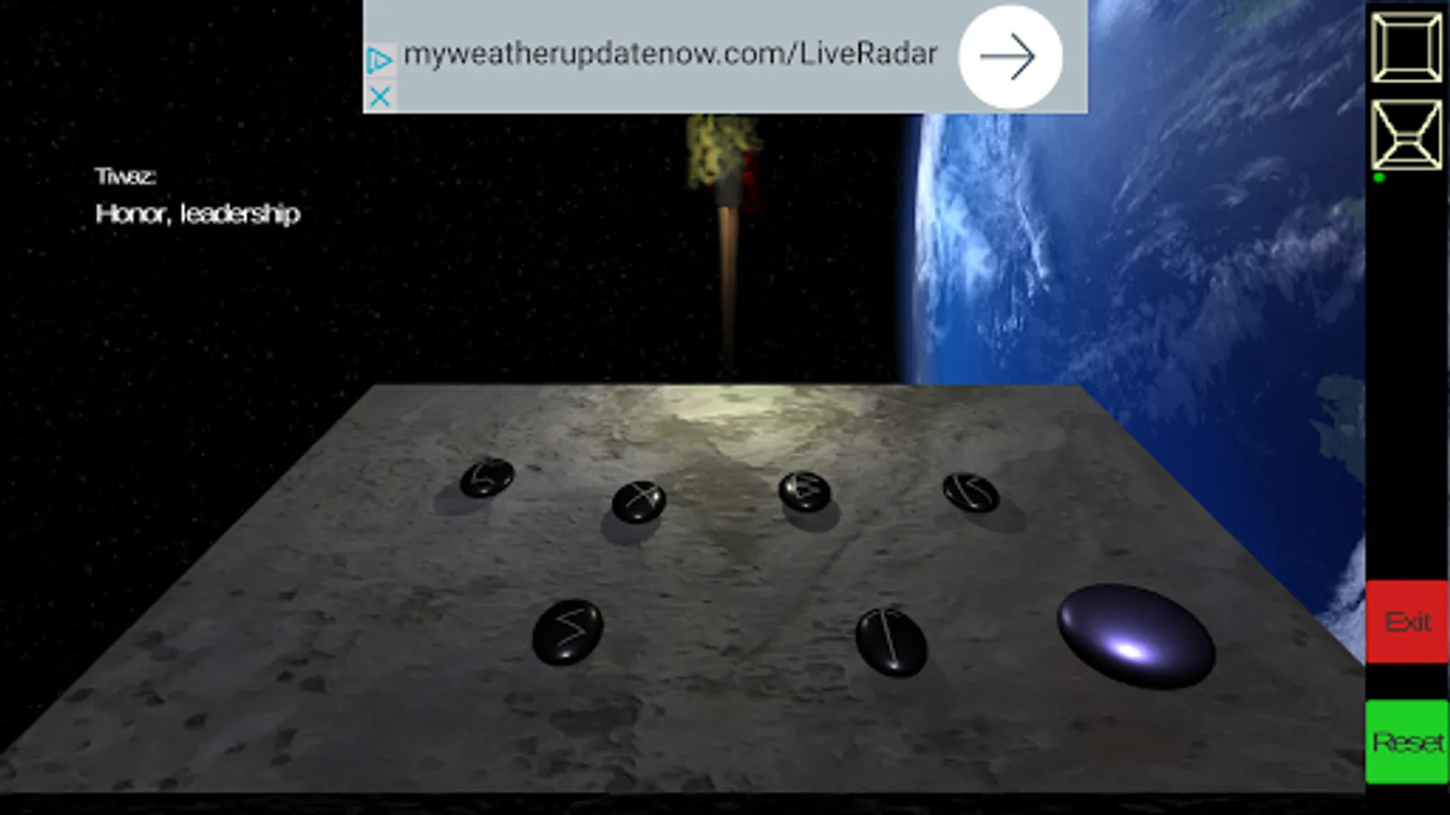 There are two camera angles with which to view your runes, perspective (angular) and vertical. These are the top two buttons on the panel at the right. The exit button is self explanatory. The reset button clears the rune selection history and the altar so you can proceed with a new reading. Holding the "down volume" and power buttons simultaneously is the android method for taking screen shots, this works in this app as well.