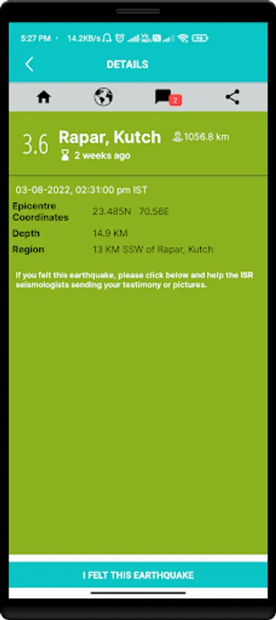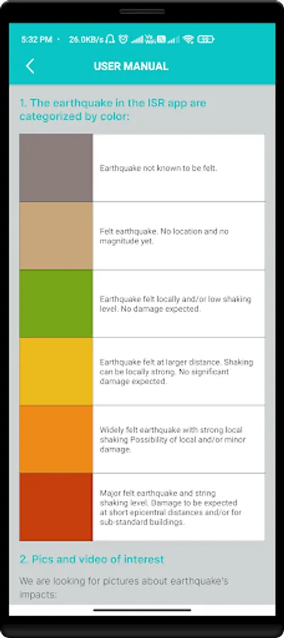 To increase the visibility and provide quick information to the general public, ISR has initiated for the development of a Mobile Application name “QuakeInfo” that can be easily downloaded and installed in any android/IOS mobile. The basic aspect of this App is to provide Earthquake location its magnitude in both tabulated as well as graphically on a Map. The App provides options for the user to choose the earthquake location notification based on user specified options such as Location, Magnitude and Time, etc. Further, it provides an option for the users to connect to us by an option “I Felt This Earthquake”, where the user can send pictures and videos.