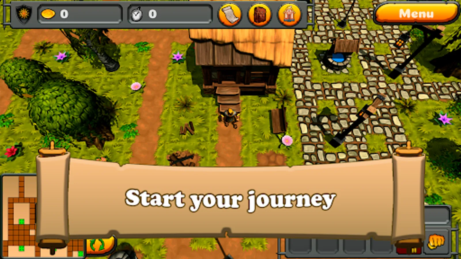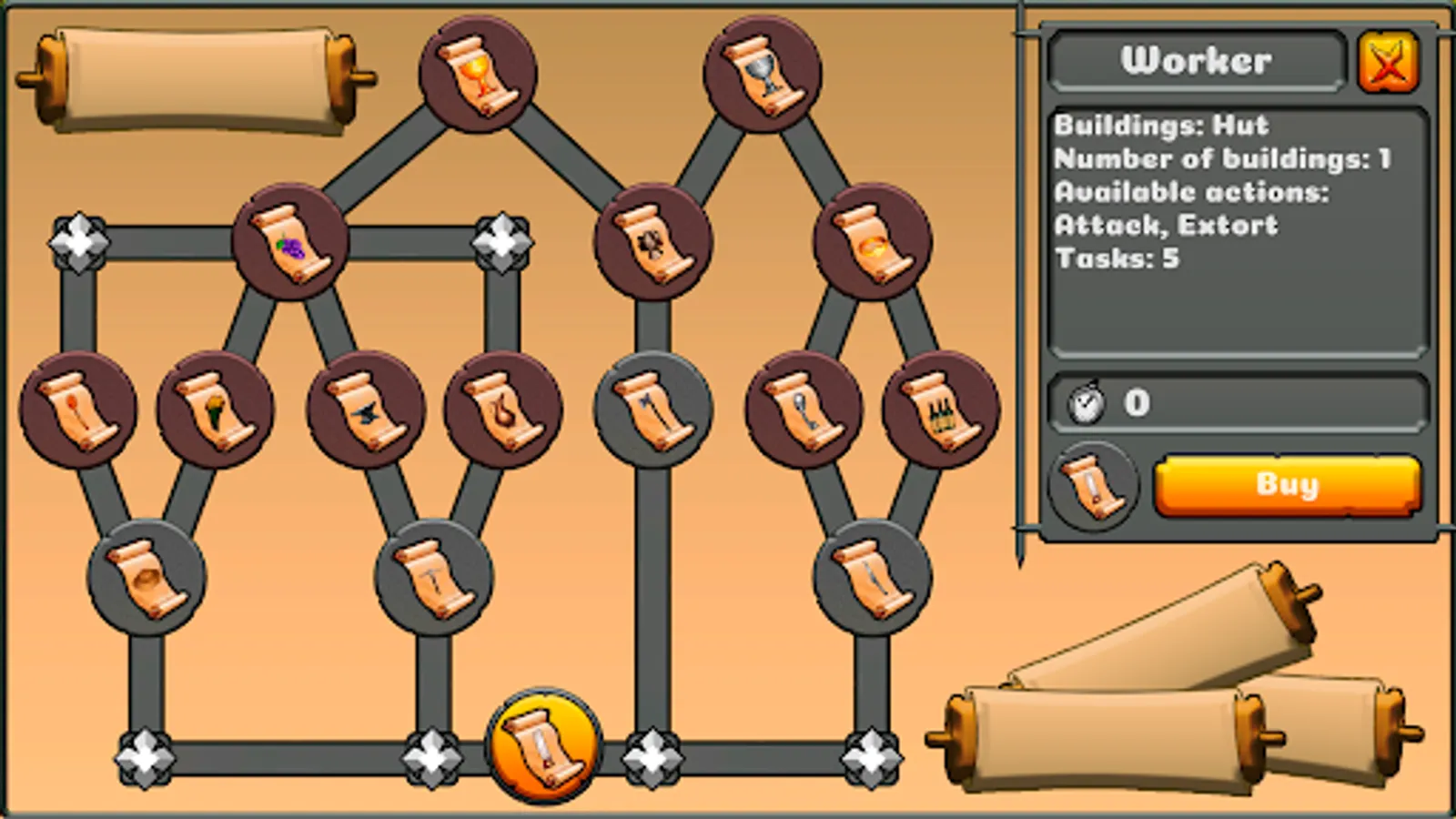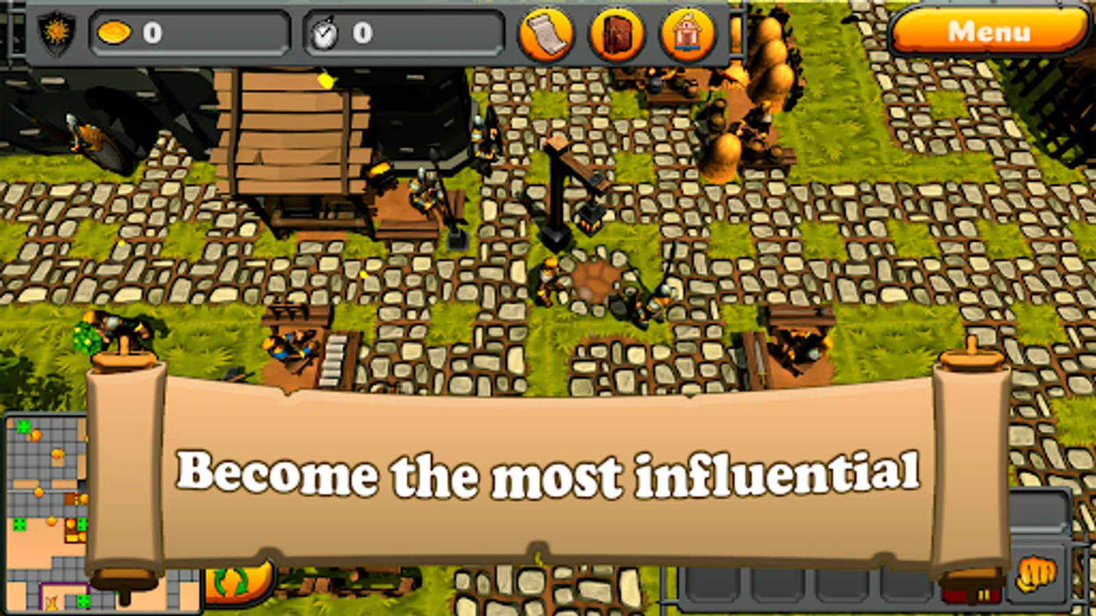 The game starts on the outskirts of the castle. You only have your own home. In the center of the map there is a castle in which a king will give you tasks. The first tasks are to chop wood and buy a license. There are also tasks for performing various actions. You can develop in three branches to be the king: develop your resource production, guard and keep order in the castle, be a criminal lord. After purchasing your first license, you will receive new tasks and unlock a new building or action. In building control panel, you can hire workers who will start producing products or doing various actions.