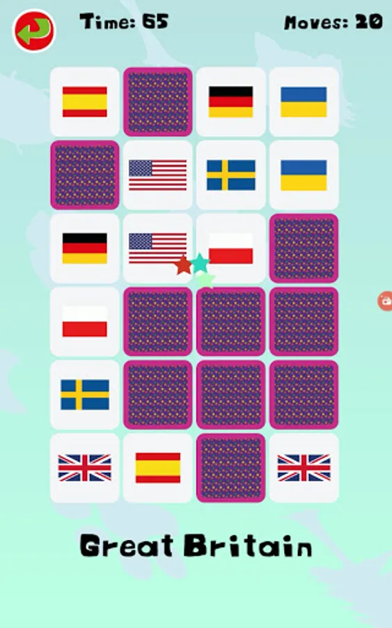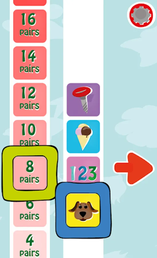 nine levels of difficulty (from 2 to 18 pairs of cards)