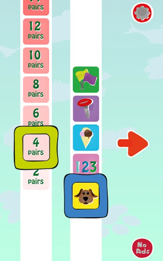 Match cards app, game is one of the memory classics. Objective is to find pairs of same images to get the point. To achieve the highest score, kids should match pairs of cards fast and with the fewest mistakes.