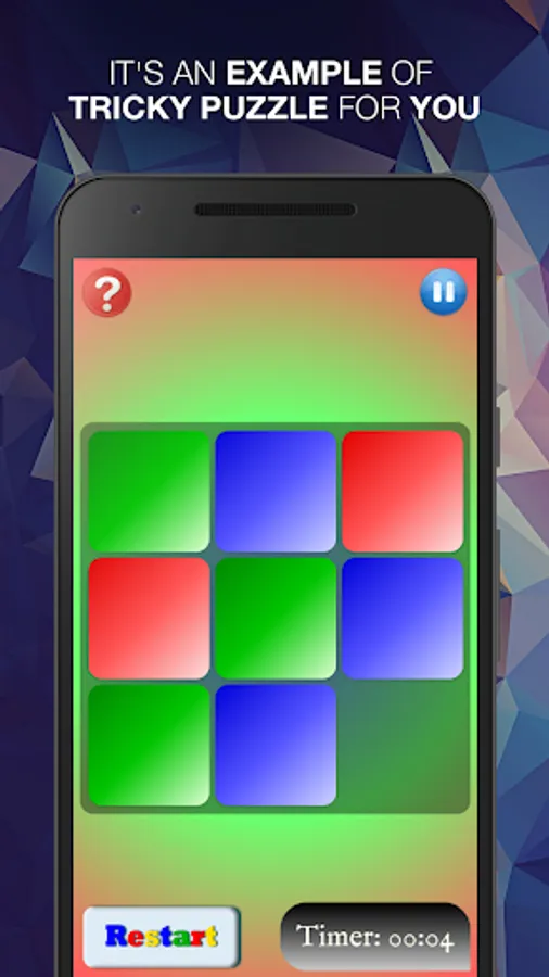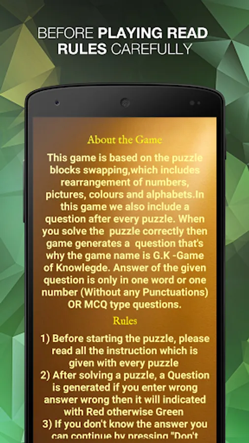 This game is based on the puzzle blocks swapping,which includes rearrangement of numbers, pictures, colors and alphabets. In this game we also include a question after every puzzle. When you solve the puzzle correctly then game generates a question that's why the game name is G.K - Game of Knowledge. Answer of the given question is only in one word or one number or MCQ type questions.