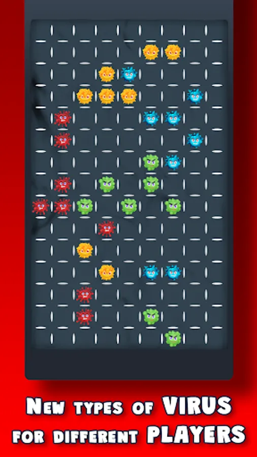 Four colors are utilized: Blue, Red, Green, and Yellow, each corresponding to a different virus. Players assume the role of these colorful viruses, aiming to construct chains to bolster their viral forces. By establishing chains, players harness the power of their viruses, subsequently enhancing their potential in combat against opposing viruses.