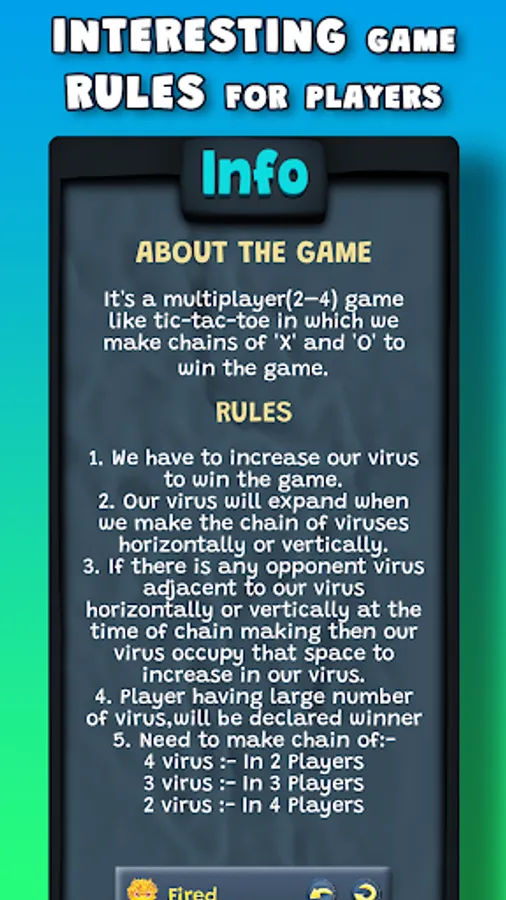 "Virus vs Virus" is a multiplayer (2-4 players) game that bears resemblance to Tic-Tac-Toe. The game revolves around creating chains of 'X' and 'O' symbols to achieve victory. The title suggests a showdown between viruses, each represented by distinct colors.