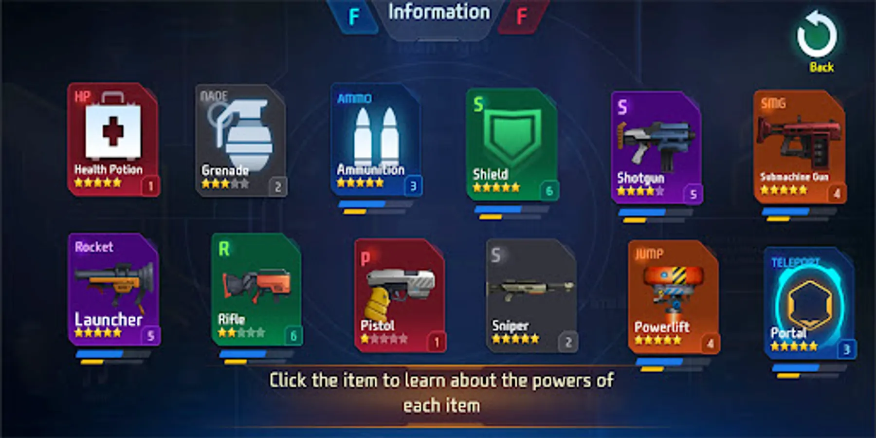 It is time for the fight of our lives. Choose a map and battle against your friends and/or random opponents. Grab the best weapon of your choice. Jump or teleport in the designated power- lift or portal to escape during critical times. Do not forget that you can heal yourself when injured and collect ammunition when you are running out. Most importantly, be careful; friends can become enemies during the match.