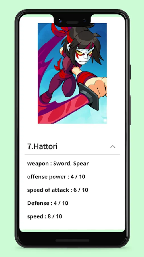 Brawlhalla Game Character's attack power, attack speed, defense power, and movement speed are listed. And you can see the pictures each character has.
