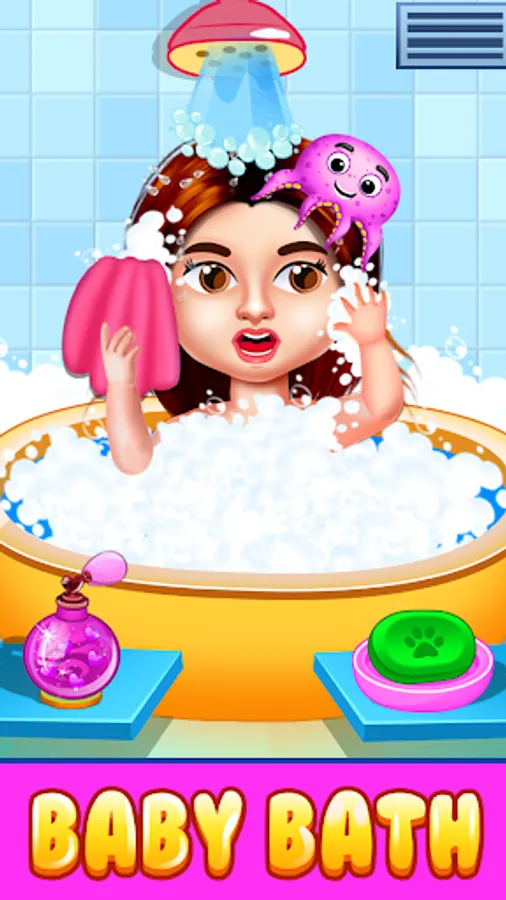 Your baby is dirty. Wipe her clean with a soap and shampoo. Make the bubbles pop and play with her bath toys.