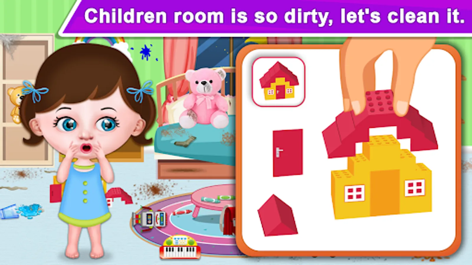 Clean children room by fixed wall and make the paint and put the toys at right place. Explore the new toy room in the house.
