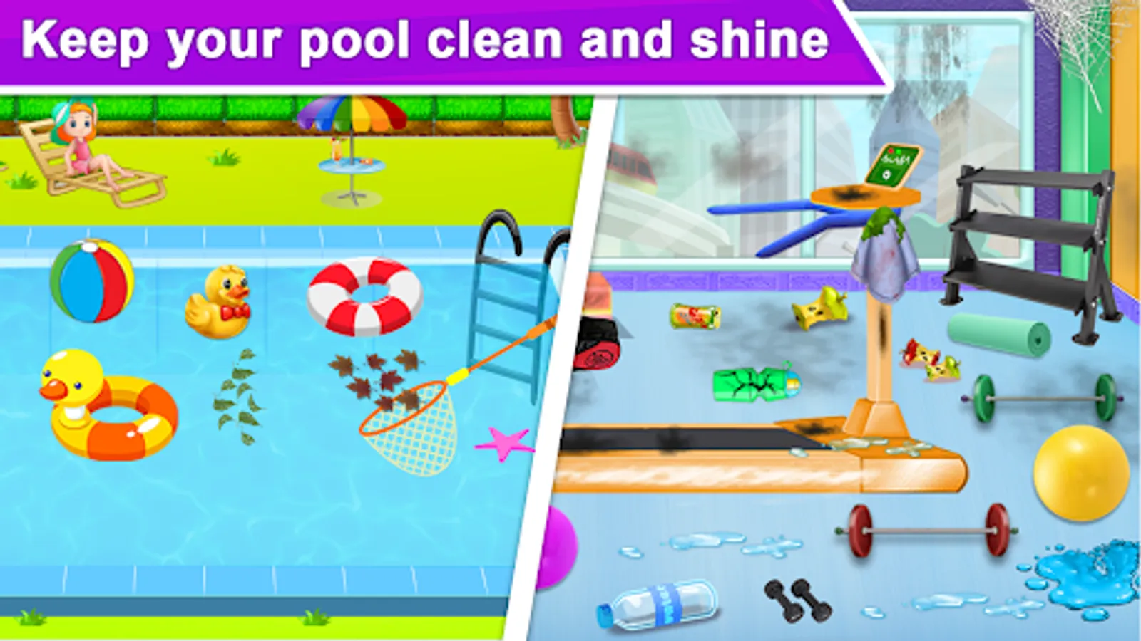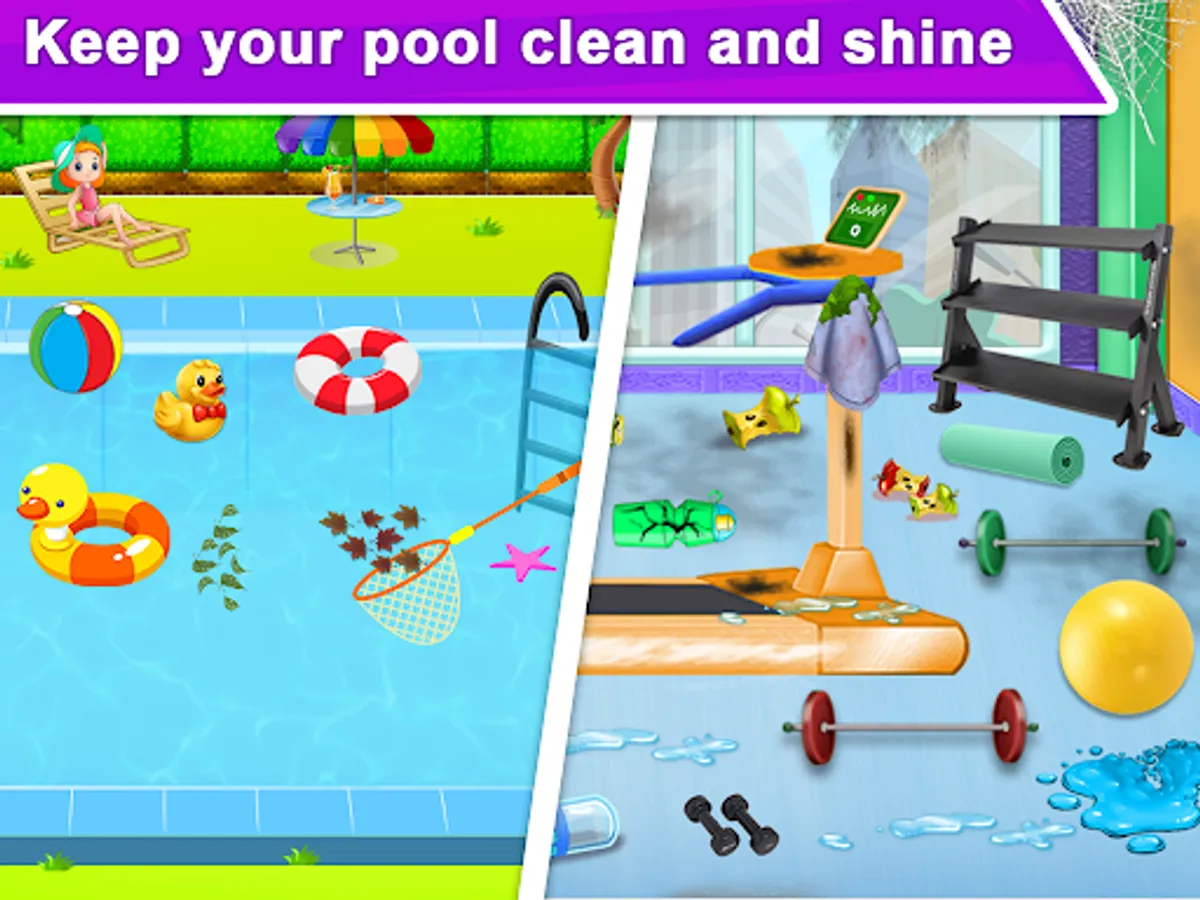 The pool has dust, mud and dirt sticking to it. Pick up your cleaning tools, a garbage can and get to the cleaning task. Pick up the pieces of trash and throw it in the dustbin. Use the towel to scrub the floor tiles and pool sides. Now clean the dirt and fill water in to the pool.