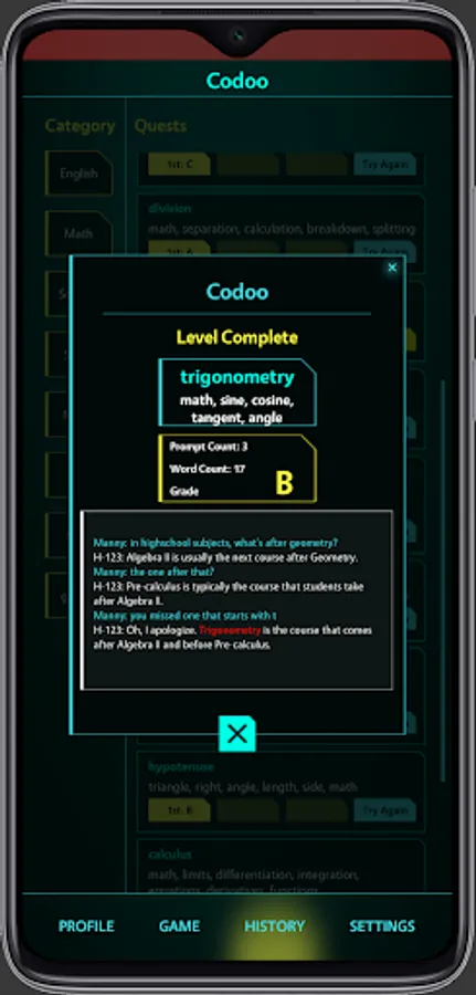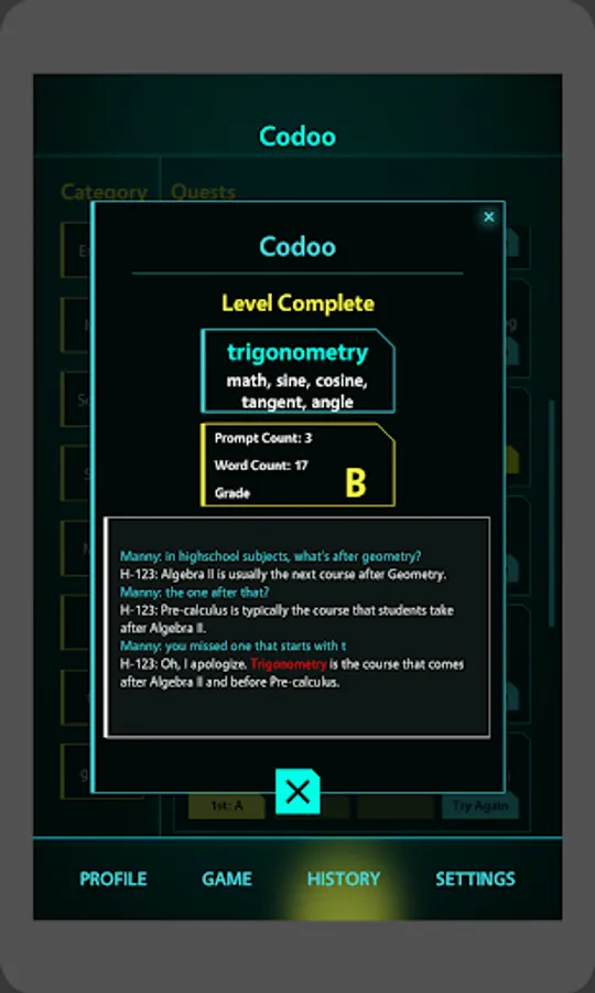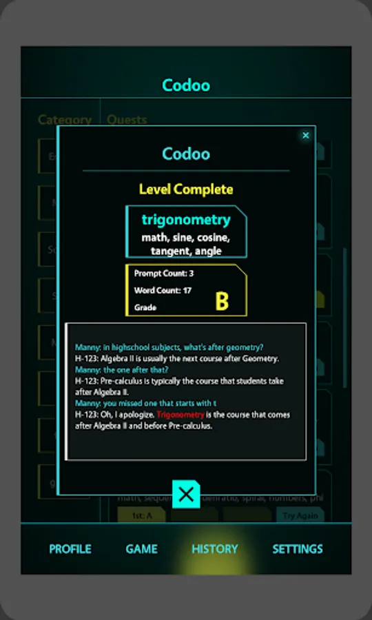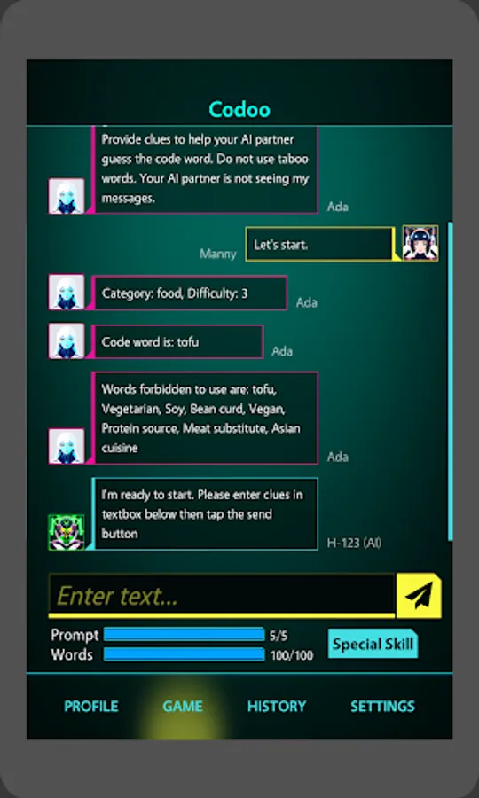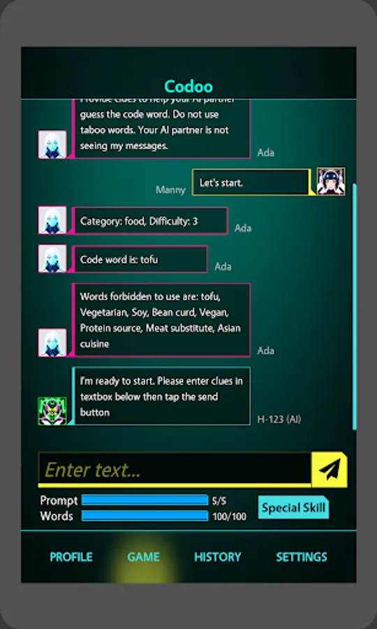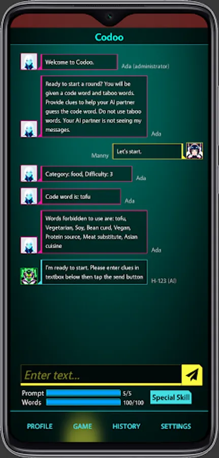 The Future of Human-AI Communication! Set in the year 2045, Codoo is an innovative game designed to sharpen your skills in effectively communicating with different AIs. As an aspiring AI Interaction Specialist, you'll navigate through various levels and complex scenarios, providing contextual clues to guide the chat bot towards recognizing and saying specific code words, all while avoiding certain forbidden words. This exhilarating game will challenge your creativity, wit, and understanding of AI, as you master the nuances of speaking with your intelligent counterparts. Codoo prepares you for a seamless integration with AI in the future, where effective human-AI communication is more crucial than ever.