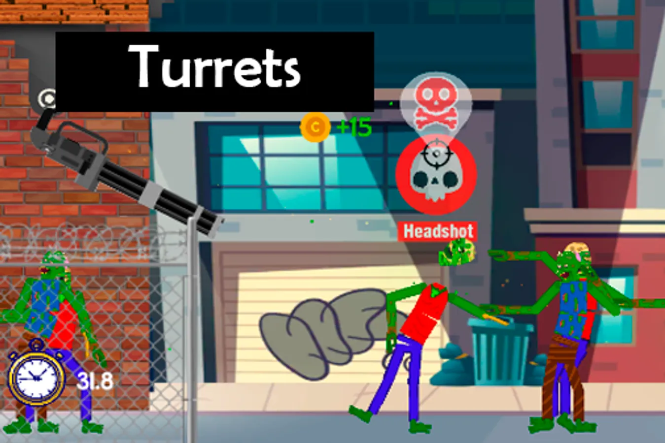 - Buy and equip turrets to defend the area