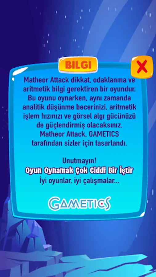 Matheor Attack, dikkat odaklanma ve aritmatik bilgi gerektiren bir oyundur. Bu oyunu oynarken, aynı zamanda analitik düşünme becerinizi, aritmetik işlem hızınızı ve görsel algı gücünüzü de güçlendirmiş olacaksınız.Matheor Attack, GAMETICS tarafından sizler için tasarlandı. Unutmayın! oyun oynamak çok ciddi bir iştir. İyi oyunlar, iyi çalışmalar.