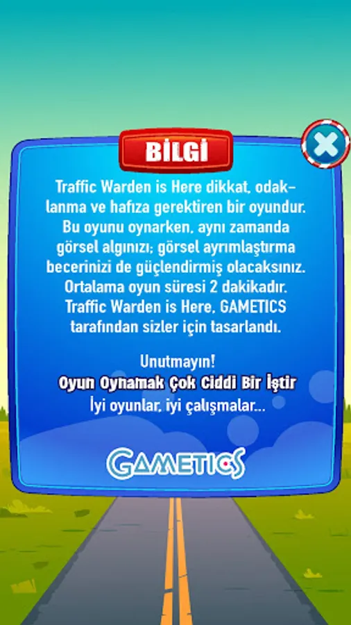 Traffic Warden is Here dikkat, odaklanma ve hafıza gerektiren bir oyundur. Bu oyunu oynarken, aynı zamanda görsel algınızı; görsel ayrımlaştırma becerinizi de güçlendirmiş olacaksınız. Ortalama oyun süresi 2 dakikadır. Traffic Warden is Here, GAMETICS tarafından sizler için tasarlandı. Unutmayın! Oyun oynamak çok ciddi bir iştir. İyi oyunlar, iyi çalışmalar...
