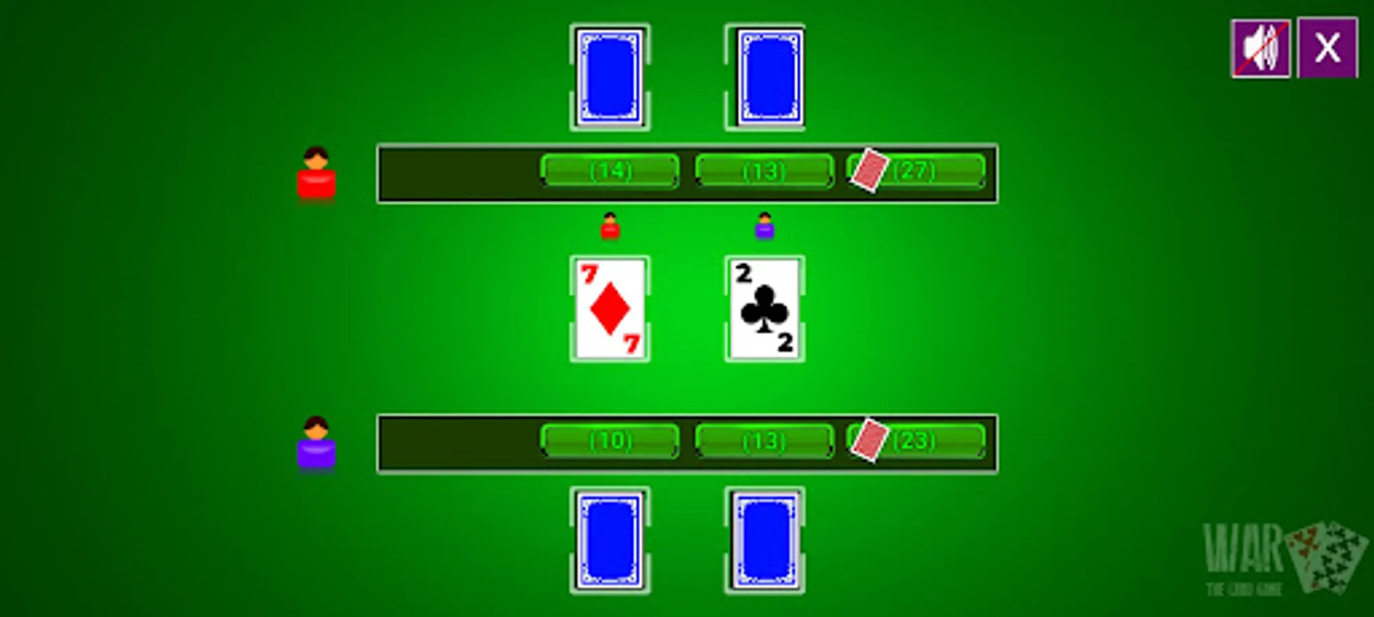 Each player turns over one card face down and one card face up. The player with the higher cards takes both piles (six cards). If the turned-up cards are again the same rank, each player places another card face down and turns another card face up. The player with the higher card takes all 10 cards, and so on.