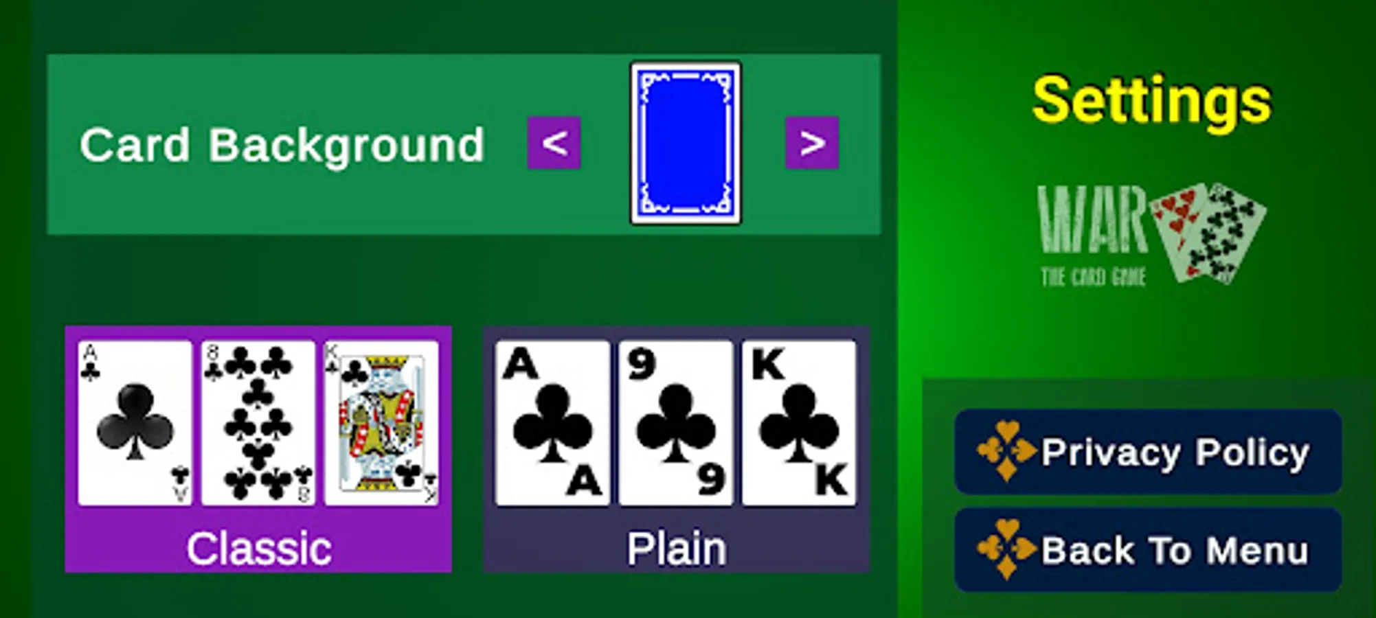 Each player turns up a card at the same time, and the player with the higher card wins both cards and puts them, face down, in his win stack.