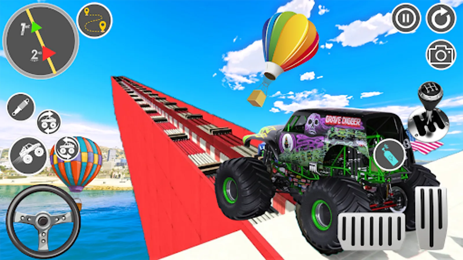 The gameplay of Monster Truck Mega Ramp stunts is straightforward and intuitive. The game consists of several levels, each of which presents a unique challenge to the player. In this super heroes monster trucks game, at each level, the player must drive their extreme monster truck stunts from one end of the ramp to the other while performing stunts and avoiding obstacles.
