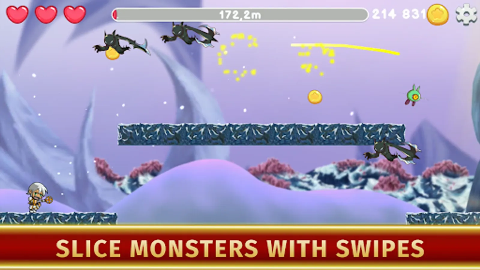 Magic Runner: Rampage Slice also has an Endless mode with increased difficulty. All purchased upgrades can be used here as well. Run as far as possible and take first place in the leaderboard.