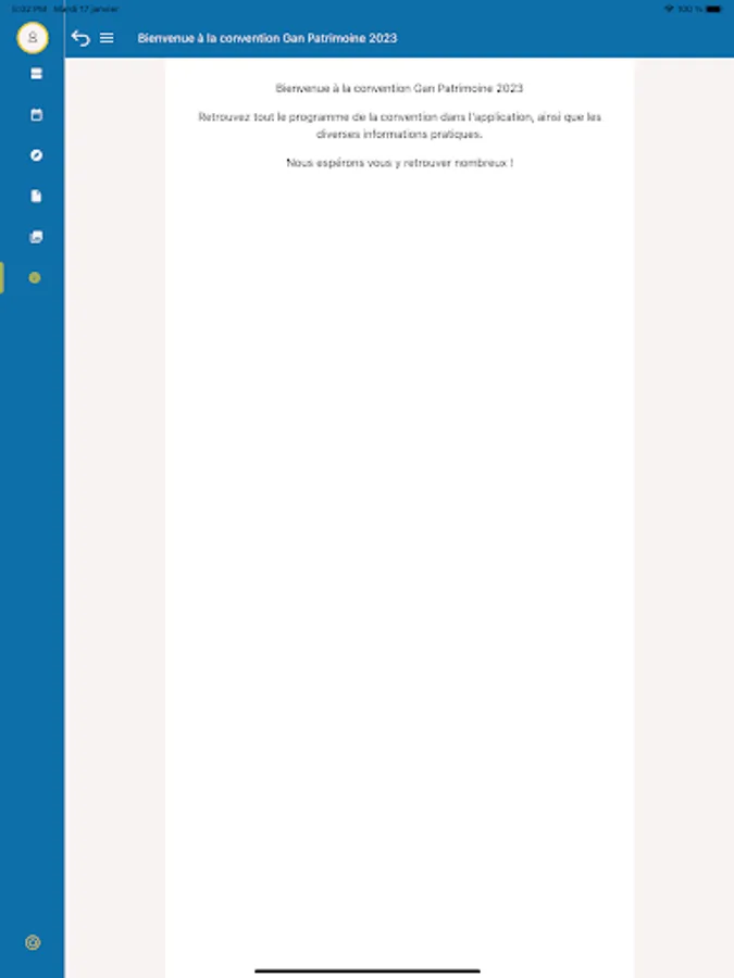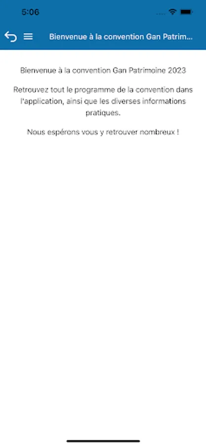 This is an official application of the Gan Patrimoine convention which will take place on March 9, 2023 with the various functionalities: Registration, program, transport request, practical information, photo libraries and interactivity through quizzes and satisfaction surveys.