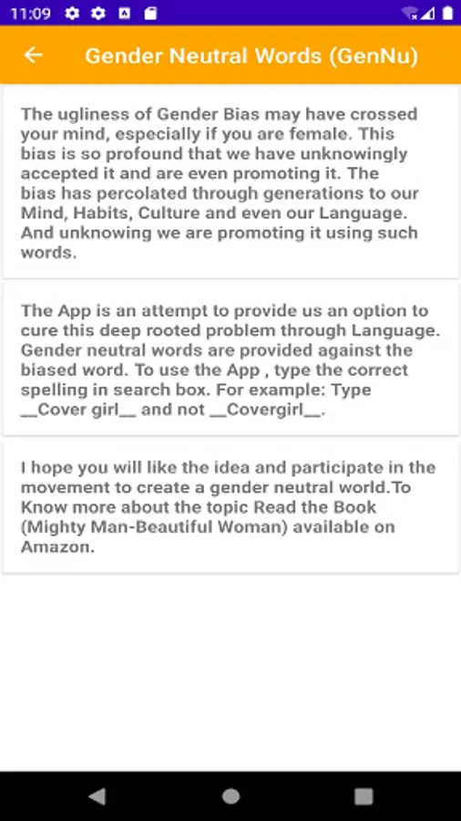 Gender Bias is one of the monstrous human-made things. You might have confronted the ugliness of Gender Bias, especially if you are female. This bias is so profound that we have unknowingly accepted it and are promoting it. The bias has deeply percolated in our customs, behaviour and our day-to-day actions. It also has affected our language, and it is the language through which this evil is transferring from one generation to another. The App is an attempt to cure the problem by replacing the gender bias words with Gender Neutral Words. I hope you will like the idea and participate in the movement to create a gender-neutral world.