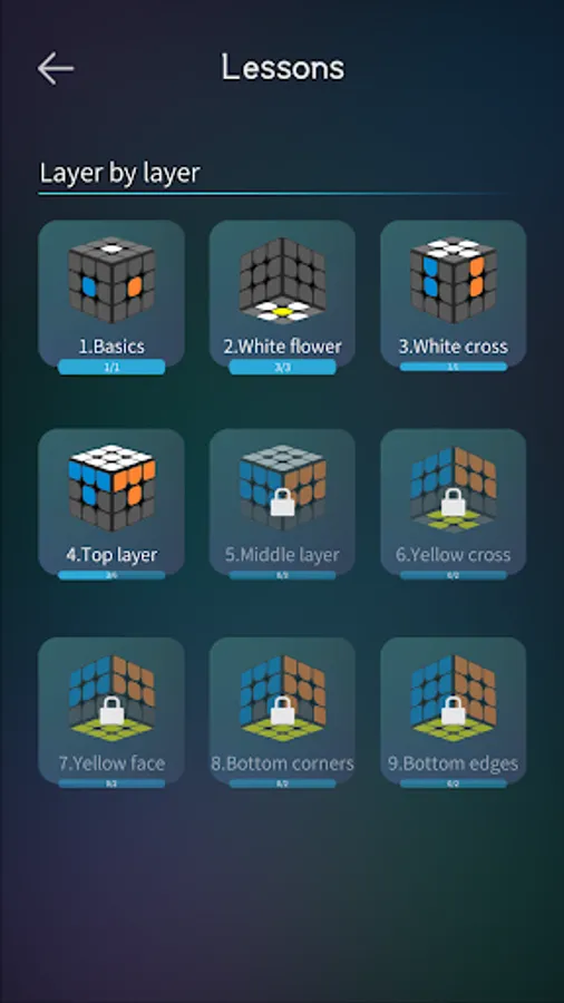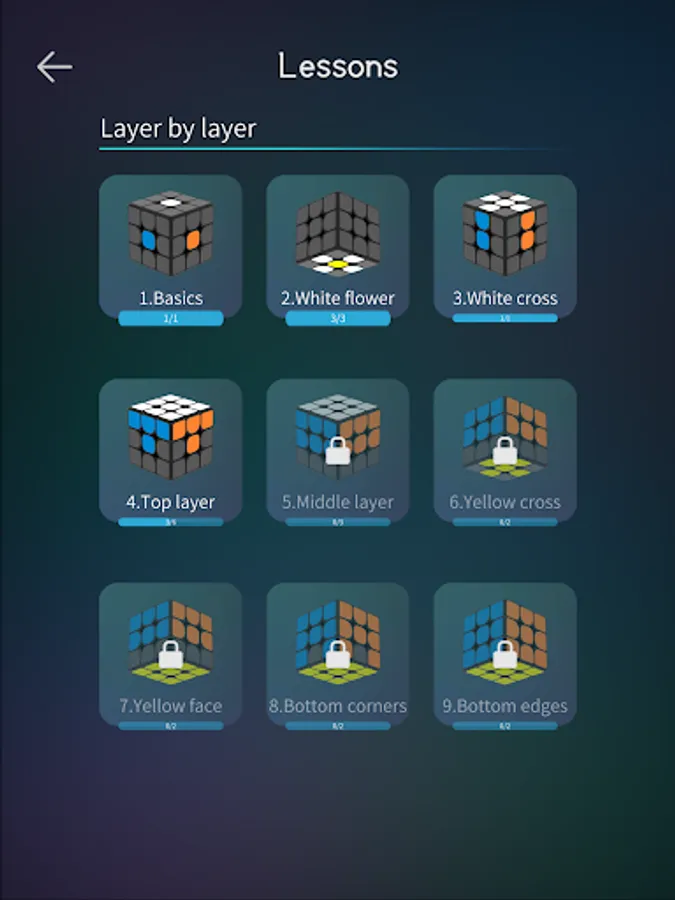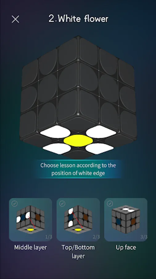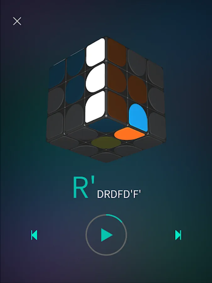 Fluent 3d animation, learn to solve the cube step by step by choose the relate status according to the real one on your hand.