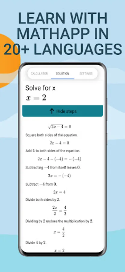 • Solve math problems in 20+ languages: English, Spanish, French, German, Italian, Chinese, Japanese, Korean, Russian, Arabic, Portuguese, Hindi, Bengali, Telugu, Marathi, Tamil, Gujarati, Punjabi, Urdu, Sanskrit and more.