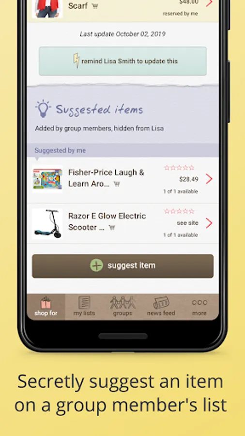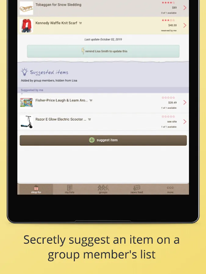 * Suggest items on other member's lists, everyone else can see but not the list maker.