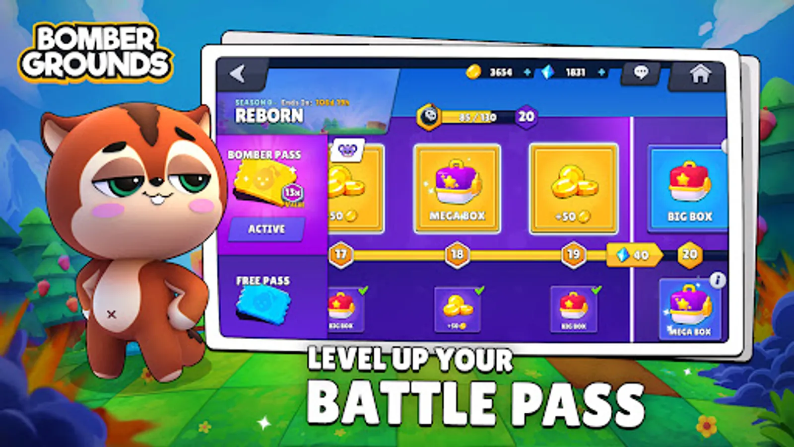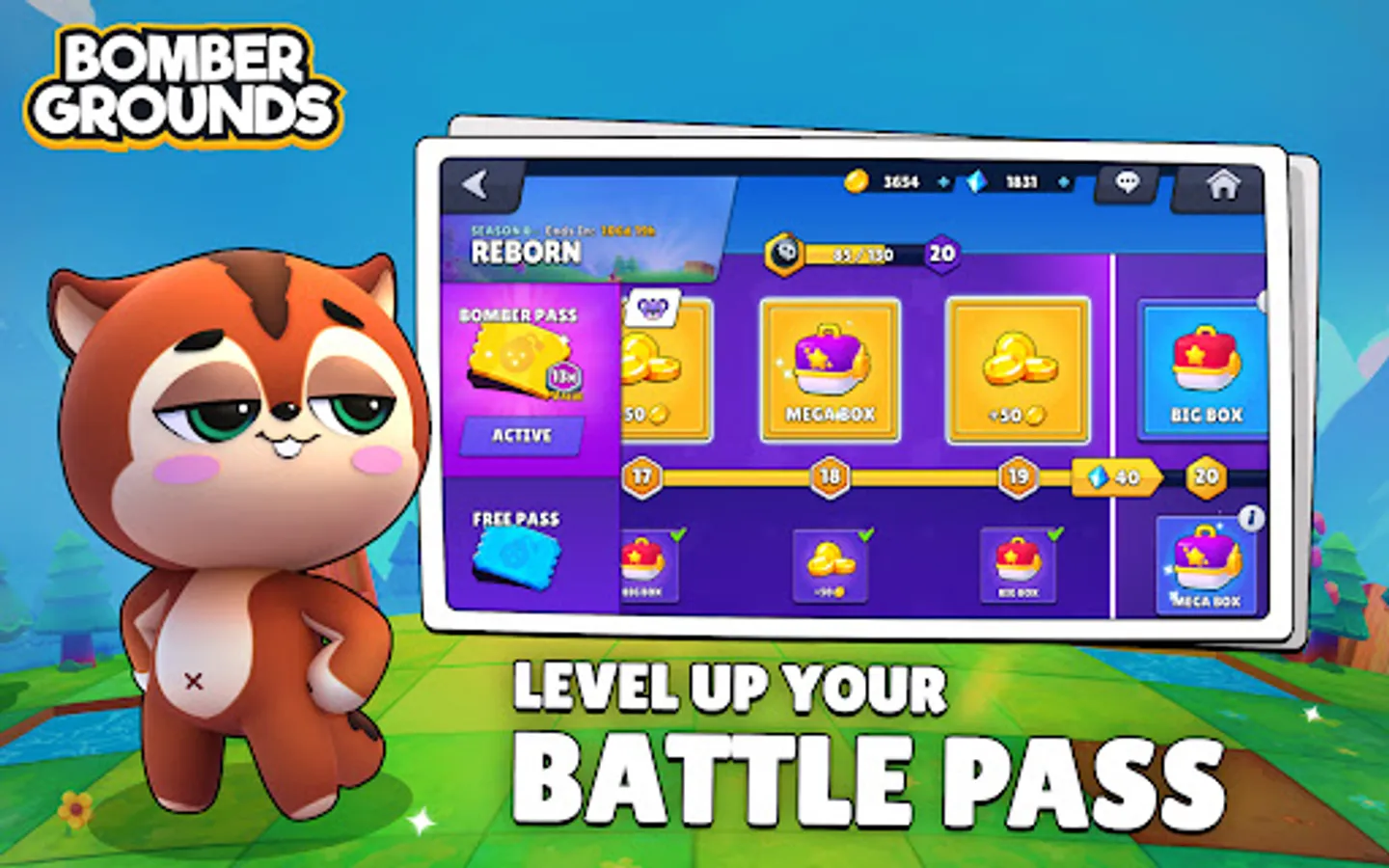 The Bomber Pass is the best way to earn rewards in Bombergrounds. In this system, you’ll be able to earn skins, characters, gems, resources and much more, just by playing!