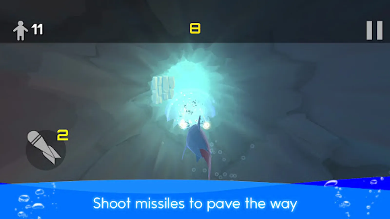 Missiles have a limited number of bullets, but you can replenish them by acquiring items that have fallen into the undersea tunnel.