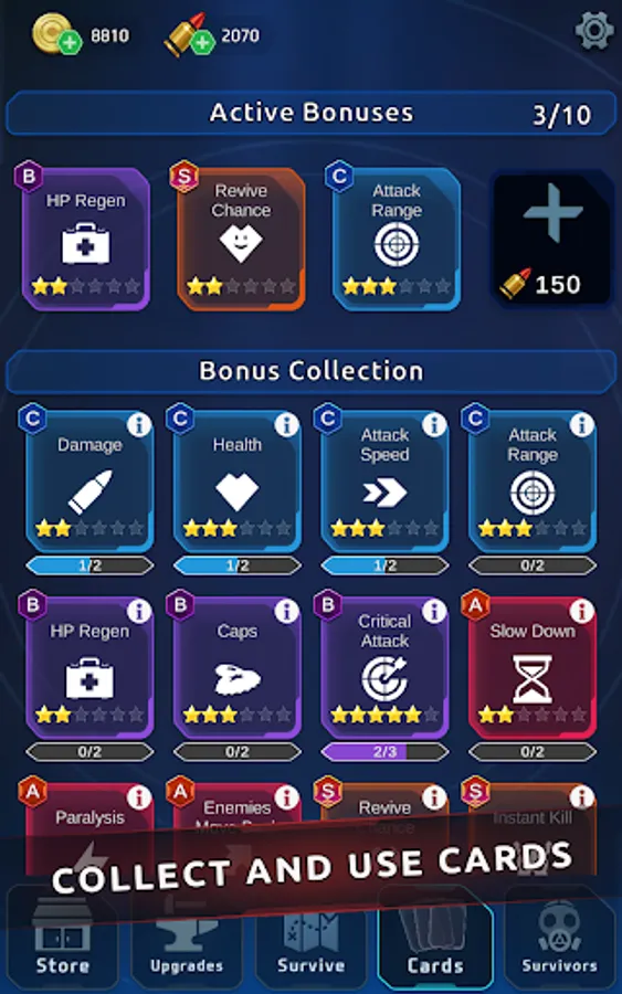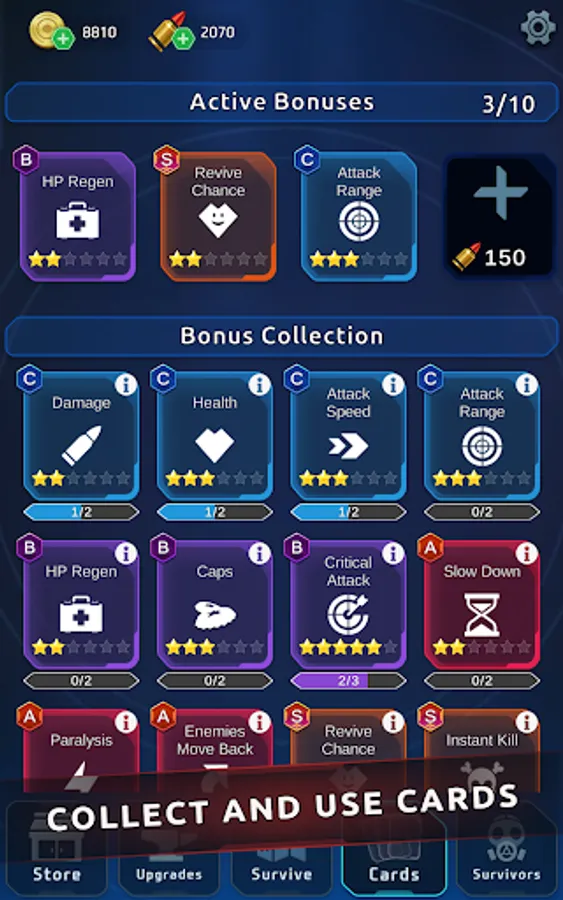 Remember the importance of cards. They greatly improve the character and tower. The higher the level of the cards, the greater the bonus you will receive. Do not forget to activate the cards, as they will not provide bonuses if not activated, and you will not be able to effectively defend against waves of zombies. Do you have what it takes to survive in Idle Survivor - Tower Defense?