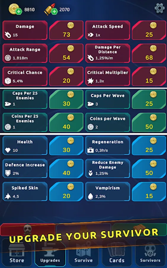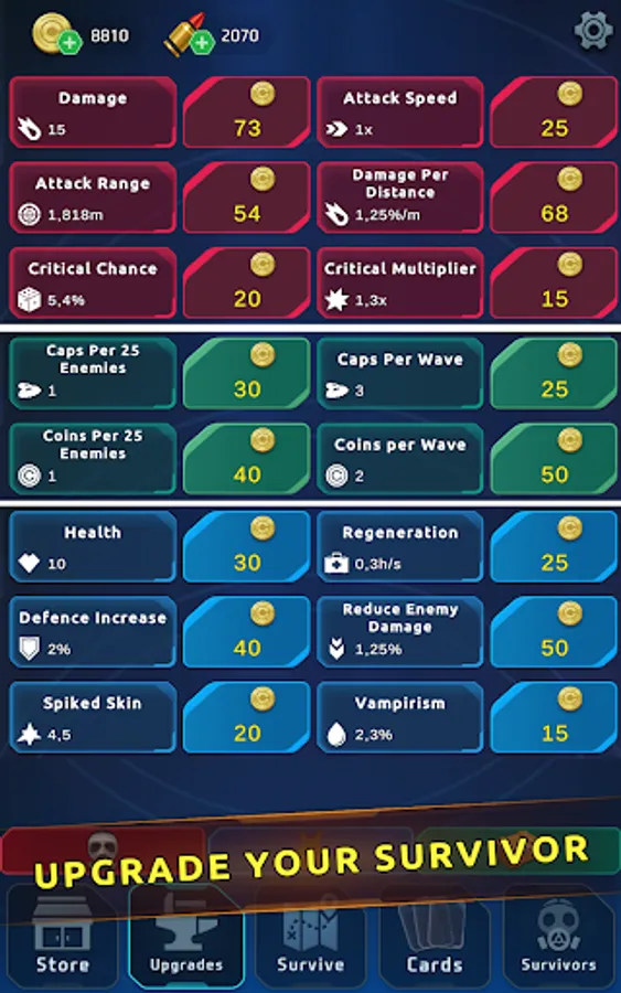 You cannot fight effectively with just basic upgrades. Unlock a variety of different upgrades to better defend your tower in idle game. There are three types of upgrades: survivor attack, tower defense and loot. Each type is important, so make sure to upgrade them all to last as long as possible.