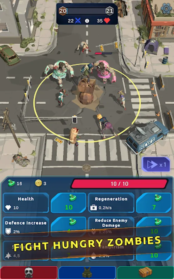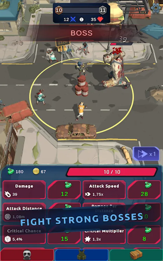 In addition to regular zombies in idle game, you will encounter unique super-mutants and bosses. Be prepared to face them and try to survive.