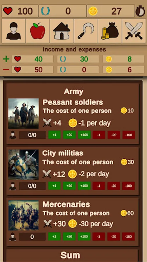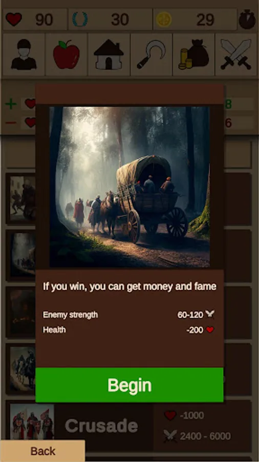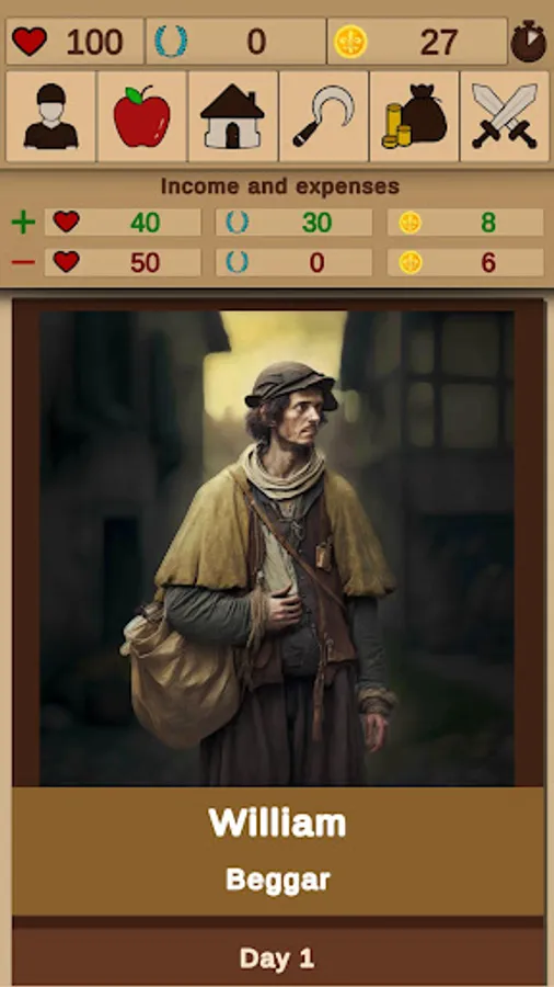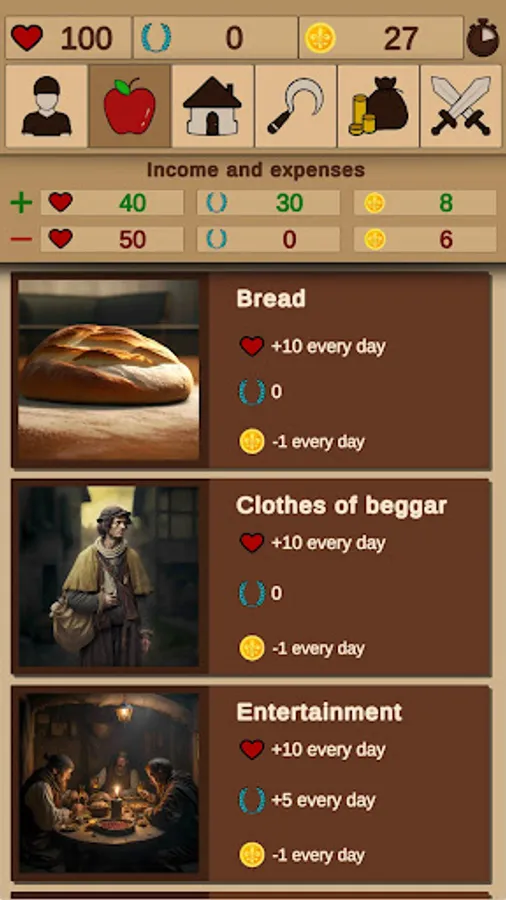 You have 3 resources: health, fame and money. Health is needed in order to work and go on military campaigns. Glory is needed in order to get a better job, own buildings and own land. And money is always needed.