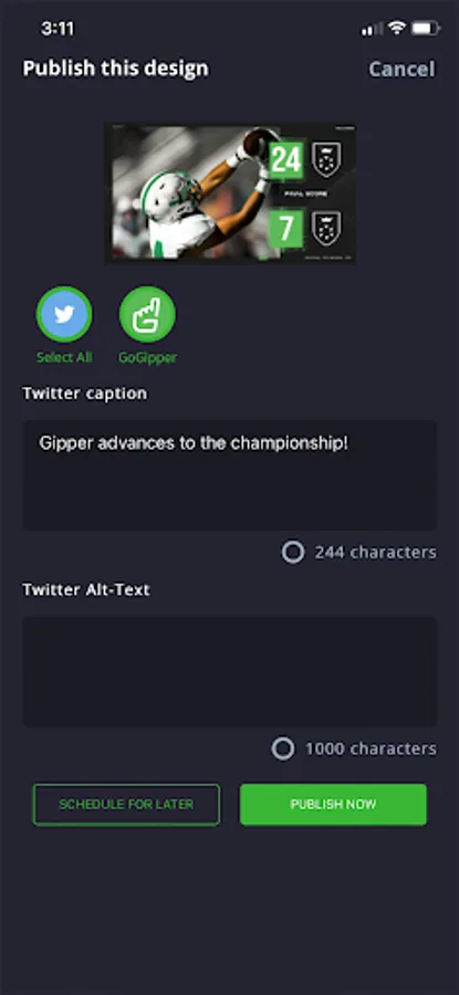 Connect unlimited Facebook, Instagram, and Twitter accounts so you can post to social media the moment your graphic is ready to share. Or, schedule any post for later — create wherever, post whenever.