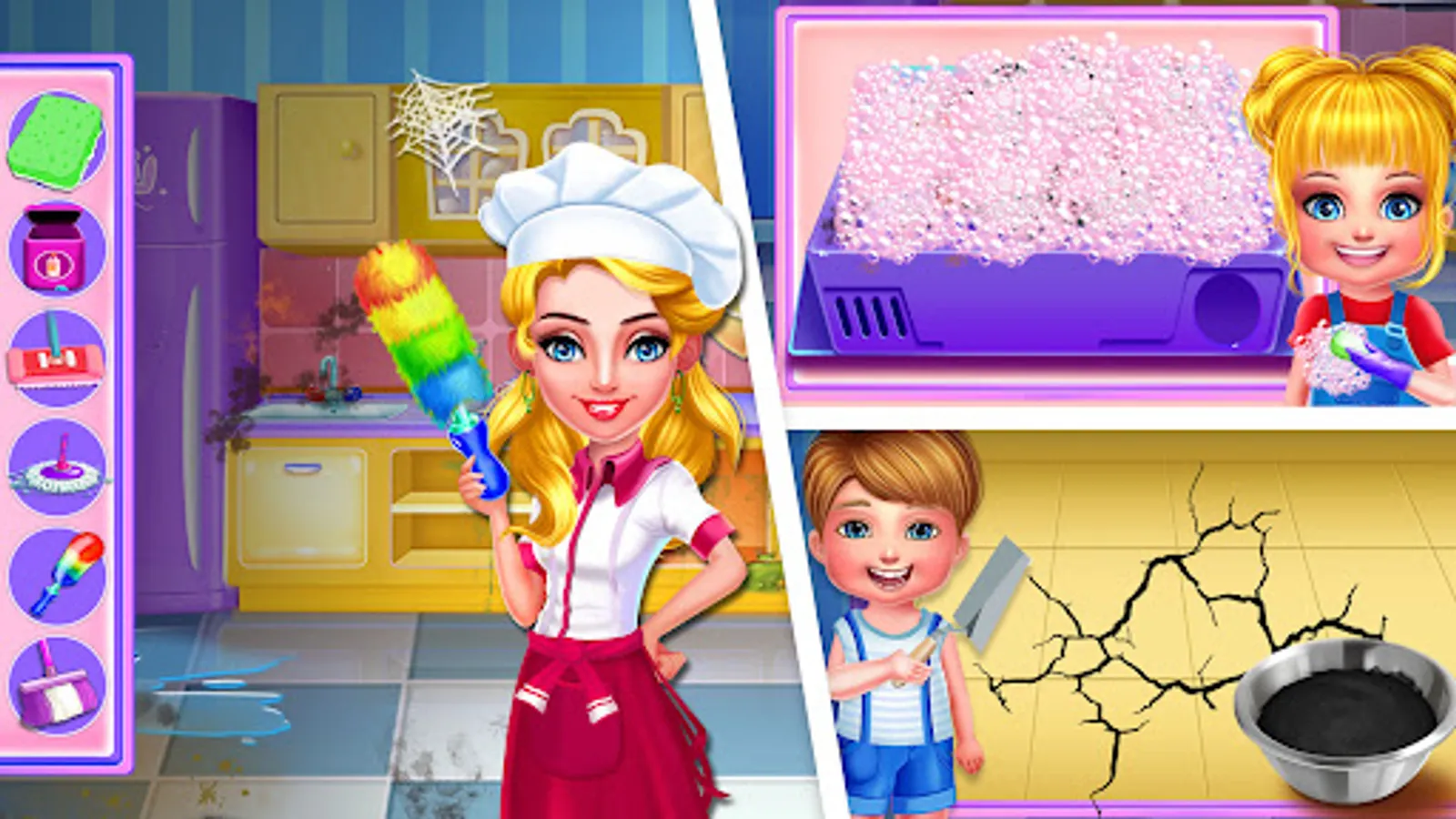 It is time to clean the kitchen, collect all the garbage, wash the windows and all the floors. In the sink, there are many dishes and you have to wash them.