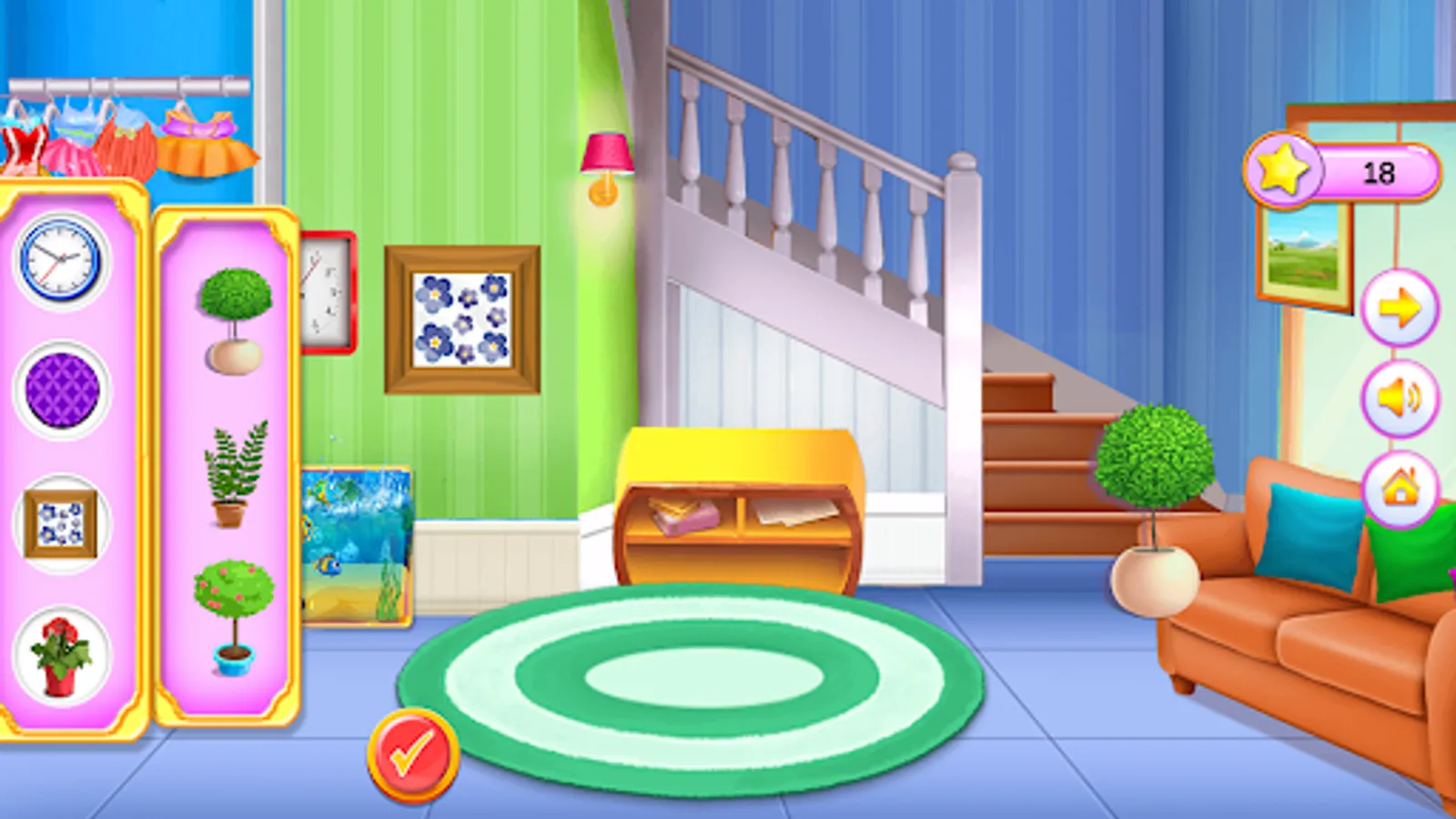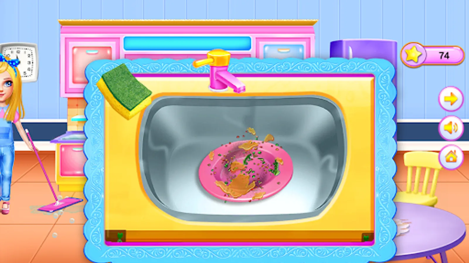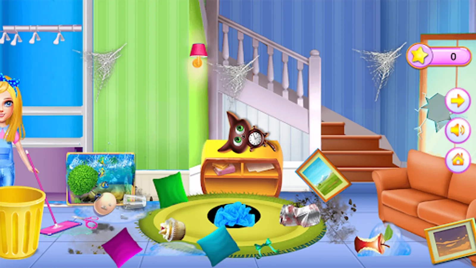 This mommy and baby messy house cleaning game for children is very nice, you will be able to clean the first time in the living room, where everything is very chaotic. First, you need to collect the garbage, then clean all the dust, wash the windows, and vacuum. It is very important to clean all the cobwebs and then arrange all the furniture. The room looks very good and now is the time to clean the kitchen as well.