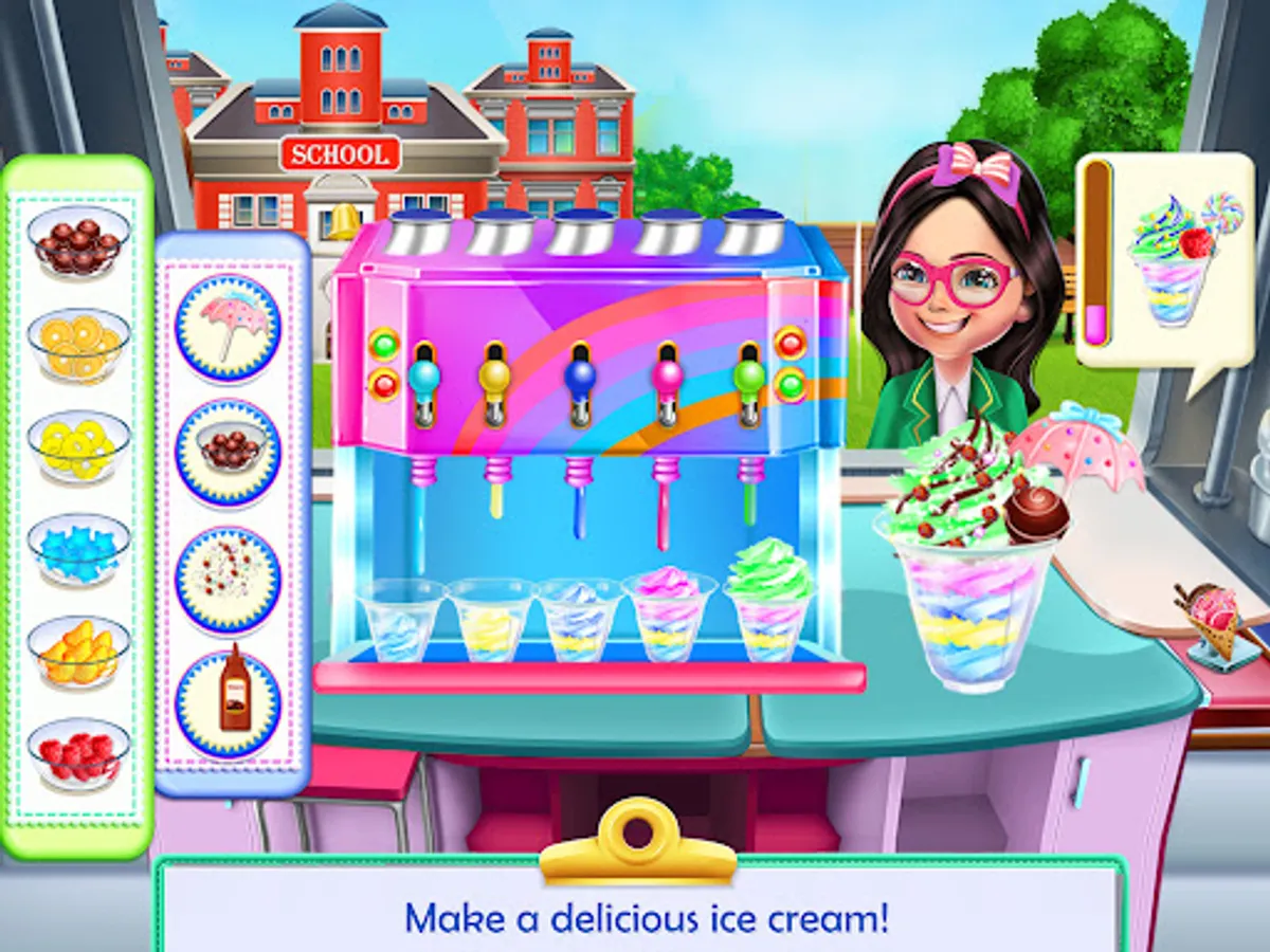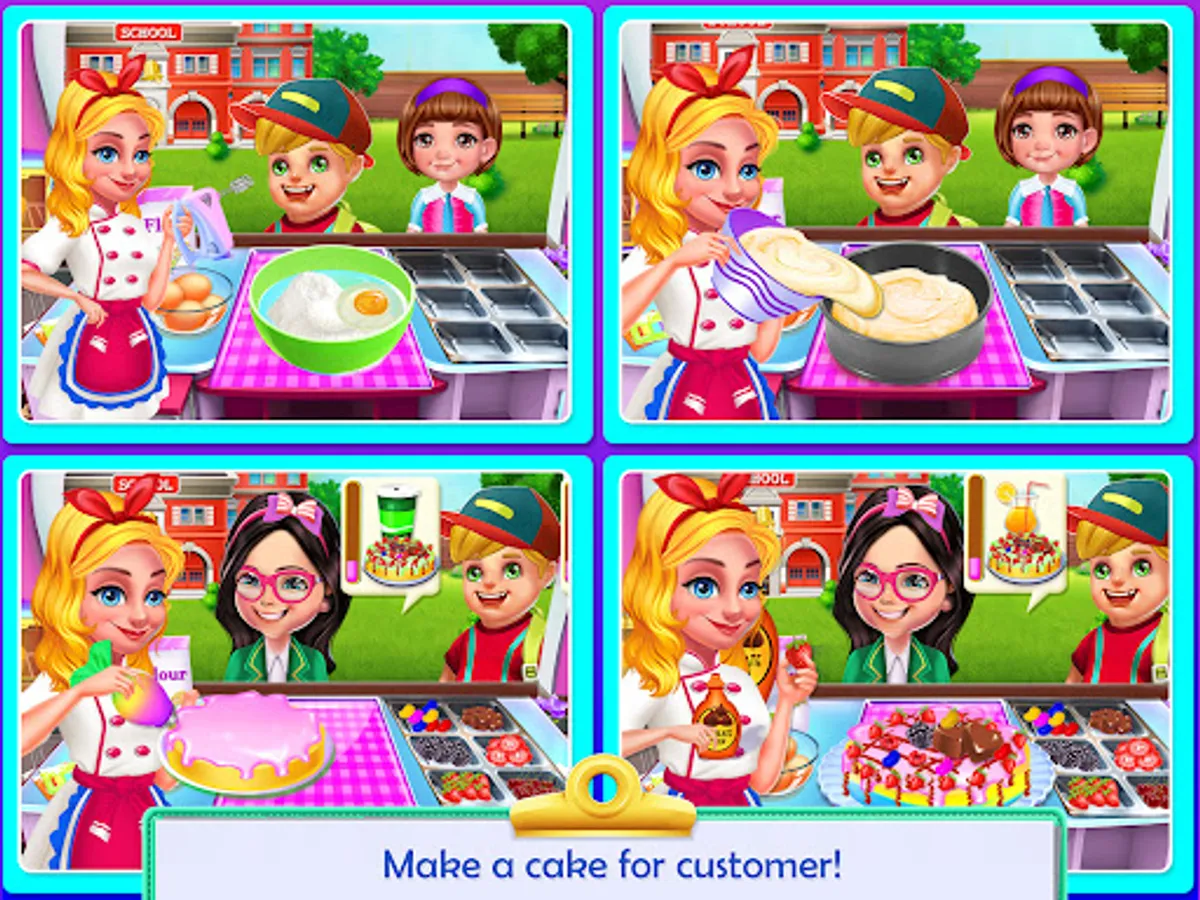 Two kids are asking for their lunch, you have to fry some potatoes and bake some meat and for dessert, you have to bake a chocolate cake. Decorate this cake with candy using all your cooking skills through this burger recipe school truck game for girls.
