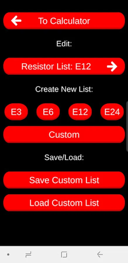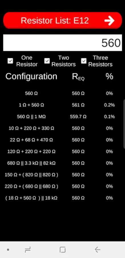 Calculate equivalent resistor values for resistors in series, parallel and both, using resistor lists E3, E6, E12, E24 or a custom list.