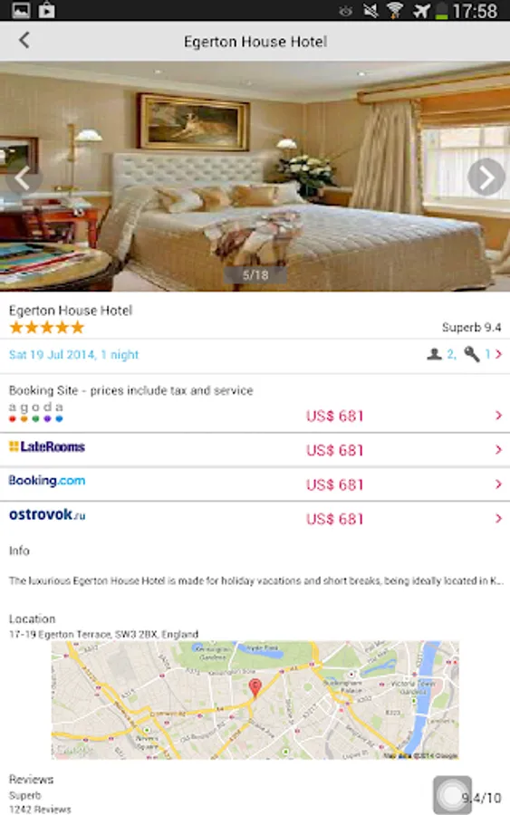* Comprehensive hotel info, including description, maps, pictures and facilities.