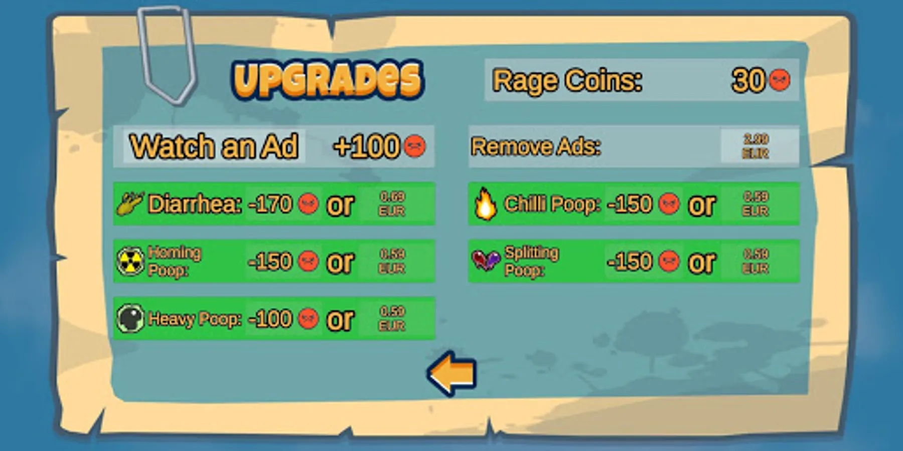 Unlock mightier types of poop in the in-app store. You can either watch an AD video to earn in-game currency to be spent on new poop types or you can pay directly with real money. There's also an option to remove ADs before each game with an in-game purchase.
