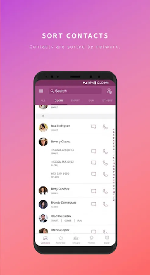 Sort Networks - Automatically identifies and sorts all your contacts by network. Friends with multiple numbers will appear under one contact with their networks specified.